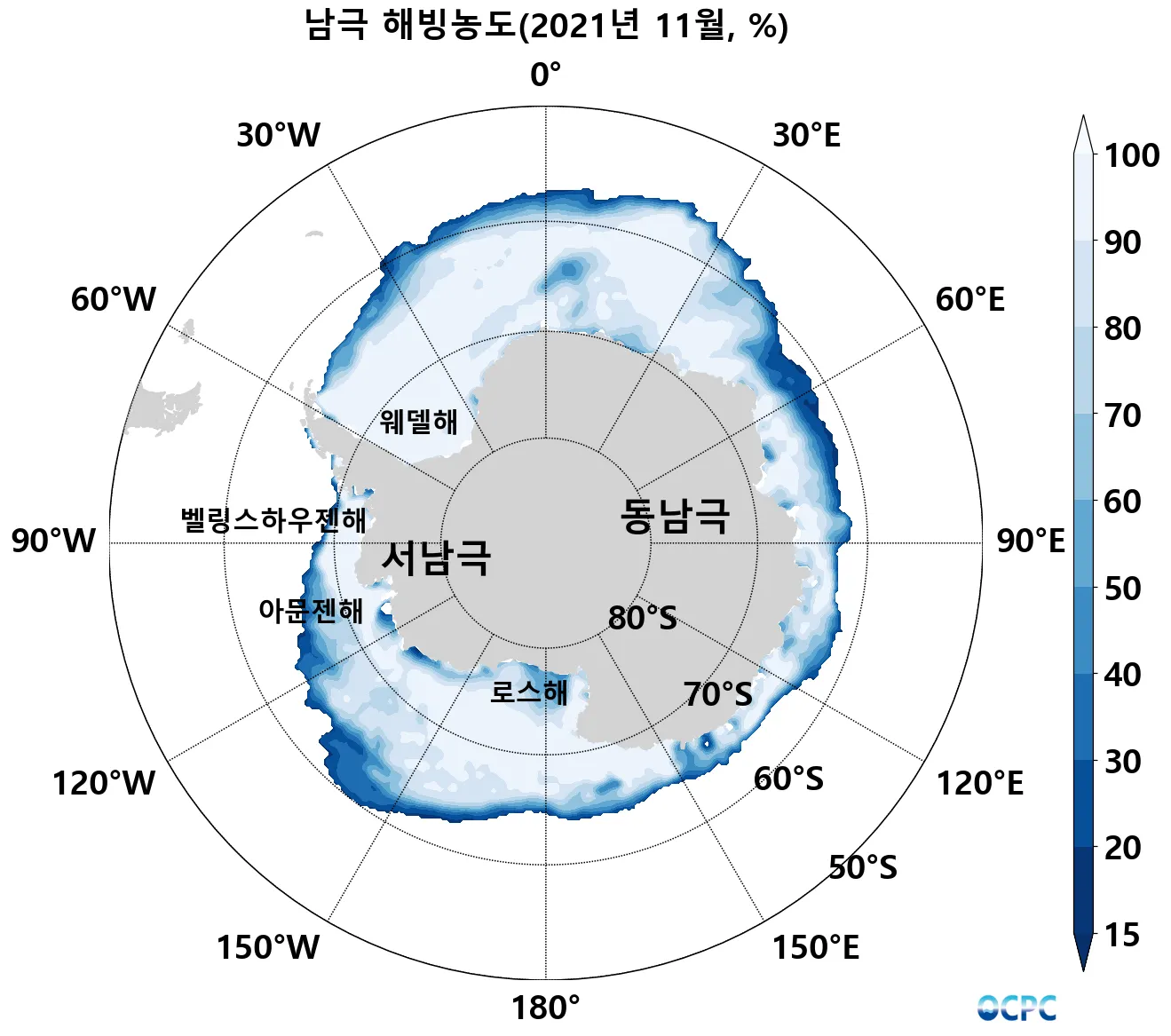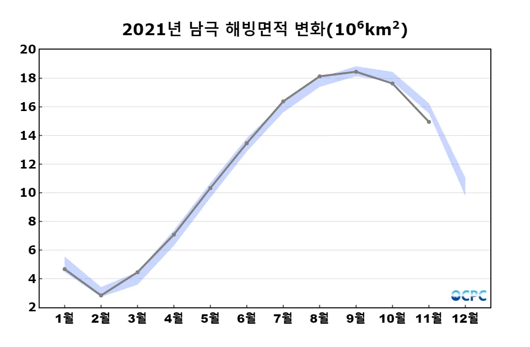 남극 해빙면적은 1,495만km²로 평년(1,590만km²)보다 95만km²(6.0%) 작았습니다.
