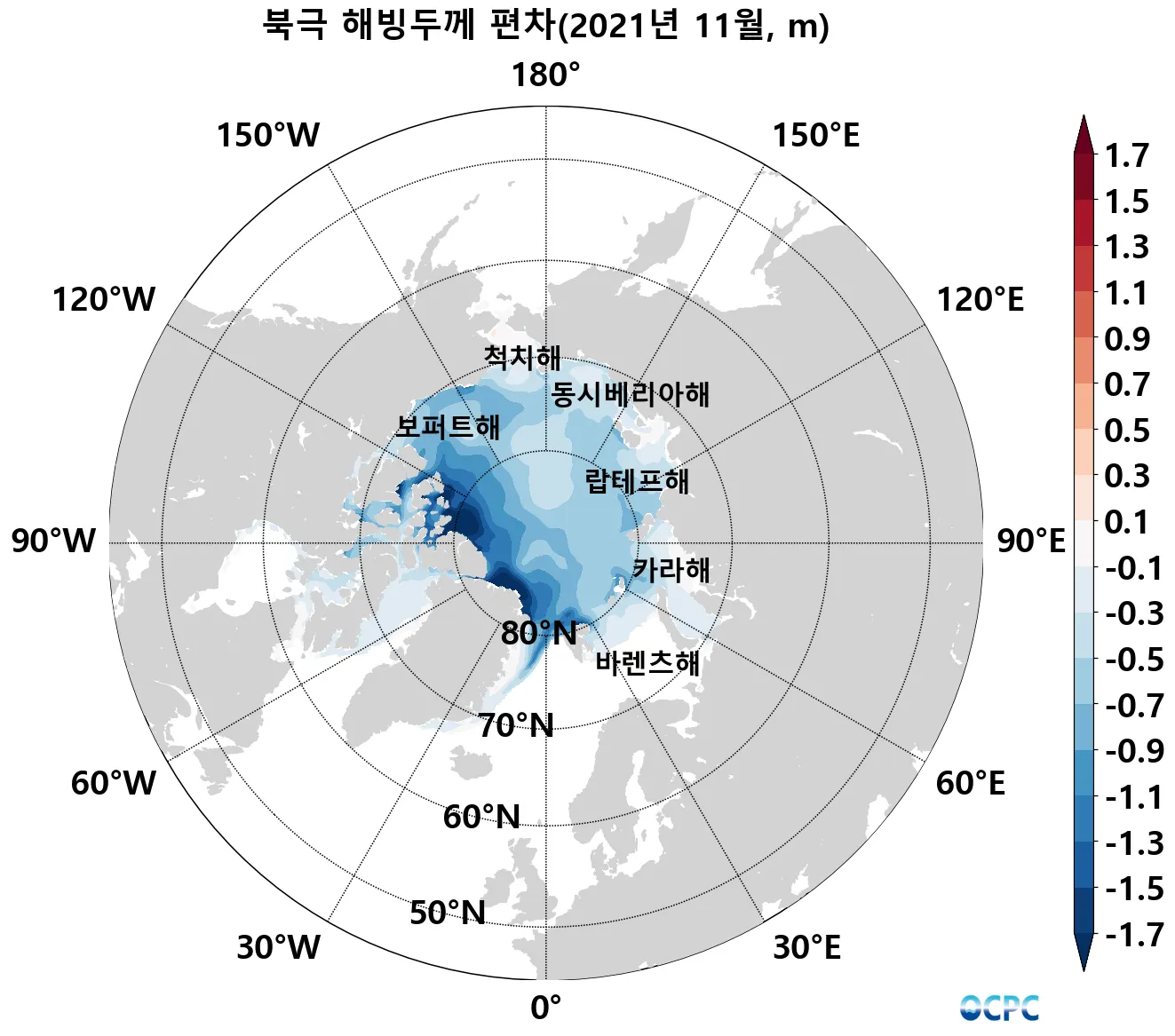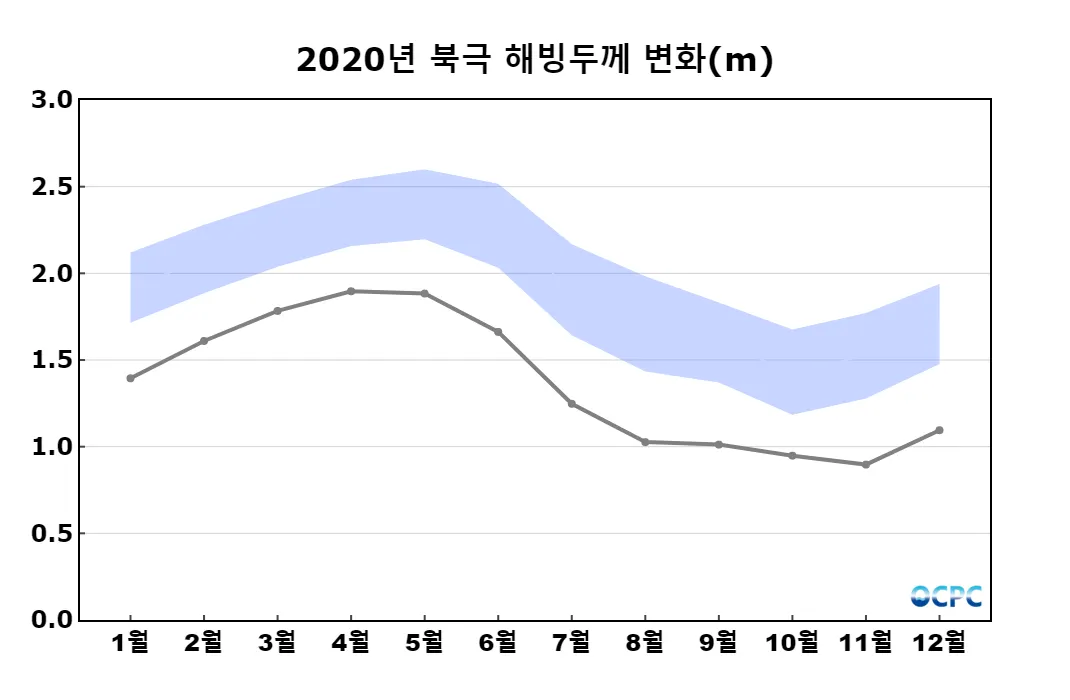 북극 해빙두께는 평년(약 1.5m)보다 약 0.55m(37.5%) 얇았으며, 최근 30년 동안 10년에 약 0.3m씩 얇아지는 추세입니다.
