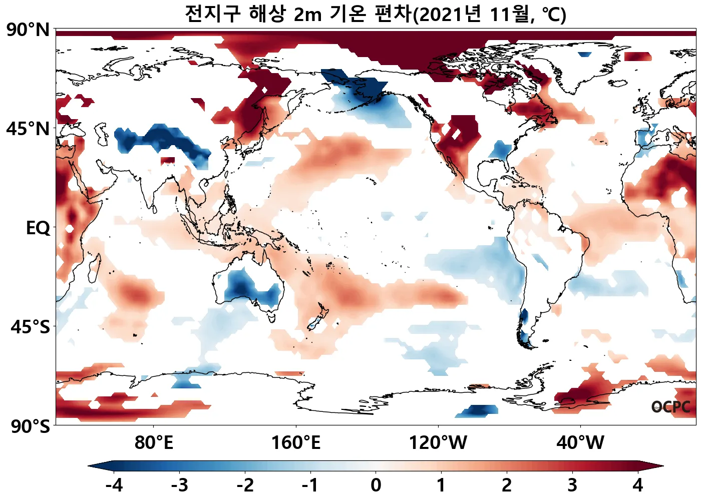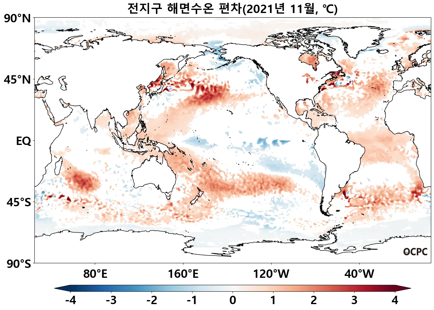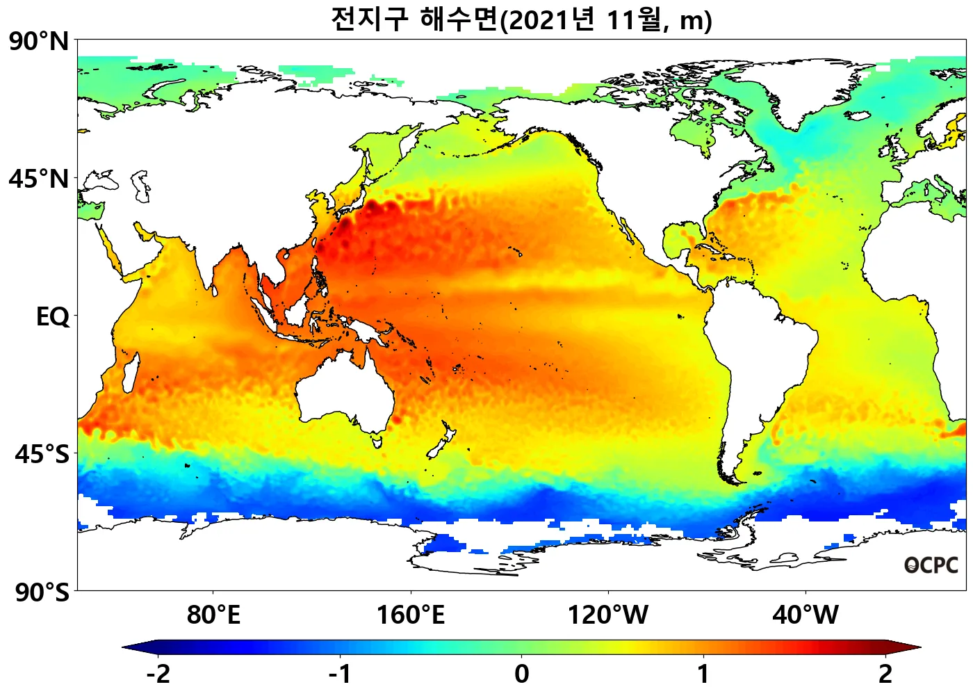서태평양(30°N~45°N, 30°S~45°S)과 남인도양(30°S~45°S)은 평년보다 높은 반면 열대 동태평양 해역은 낮았습니다.
