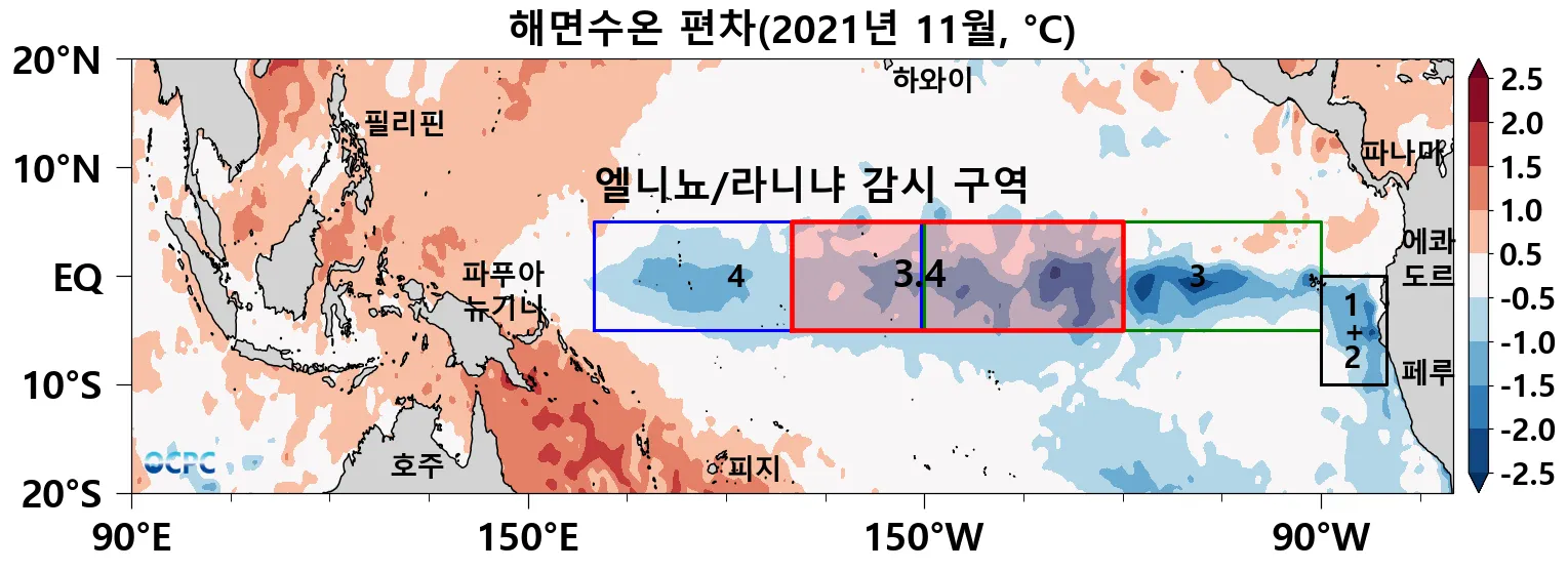 엘니뇨/라니냐 감시구역인 열대태평양 Nino3.4 해역(5°S~5°N, 170°W~120°W)의 11월 평균 해면수온 편차는 라니냐에 해당합니다.
