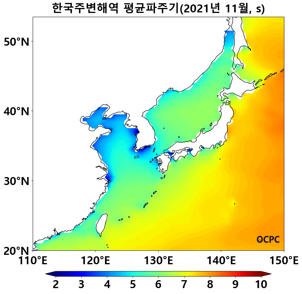 동해와 황해의 평균파주기는 평년(5.7초, 4.6초)과 비슷했고, 동중국해는 평년(5.9초)보다 낮았습니다.