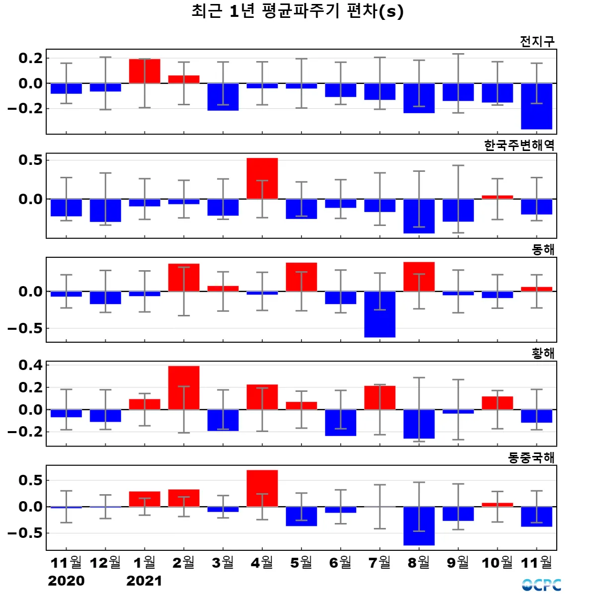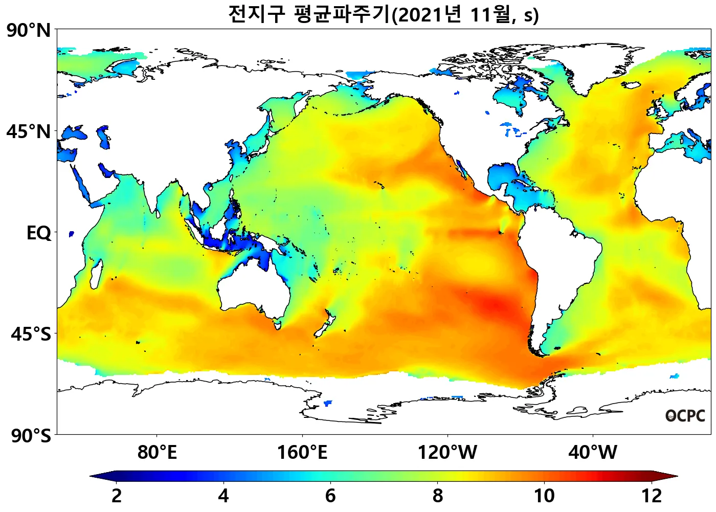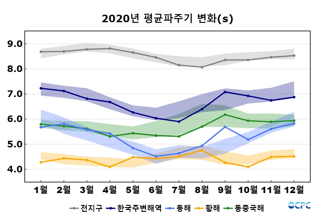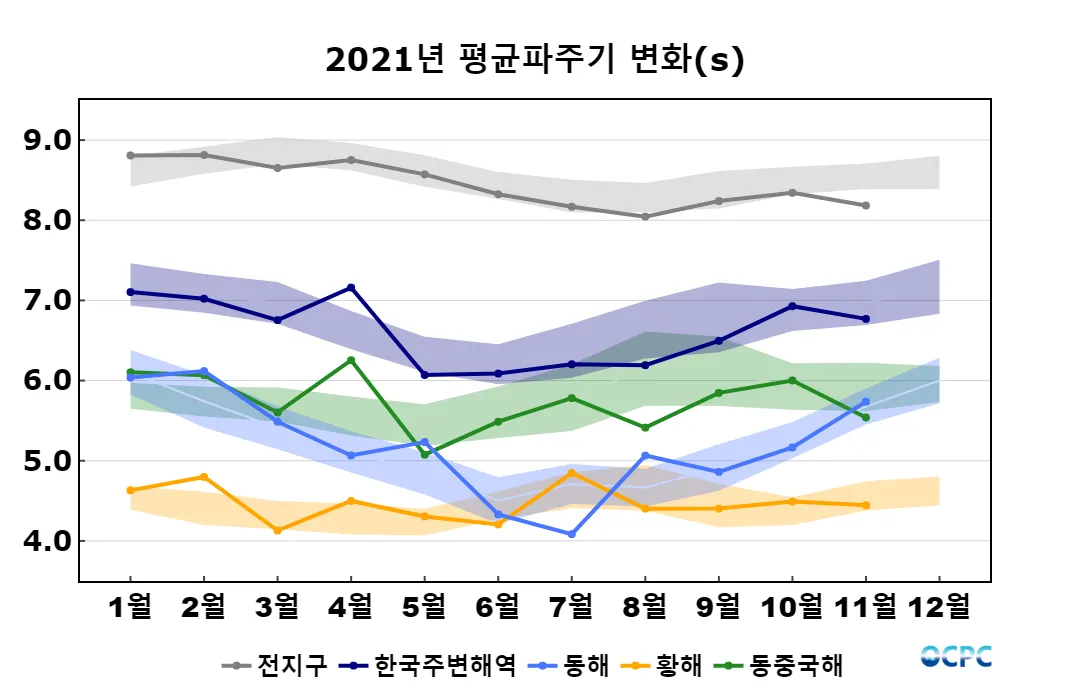 전지구, 동중국해의 평균파주기는 평년보다 낮았으며, 한국주변해역, 동해, 황해는 평년과 비슷했습니다.
