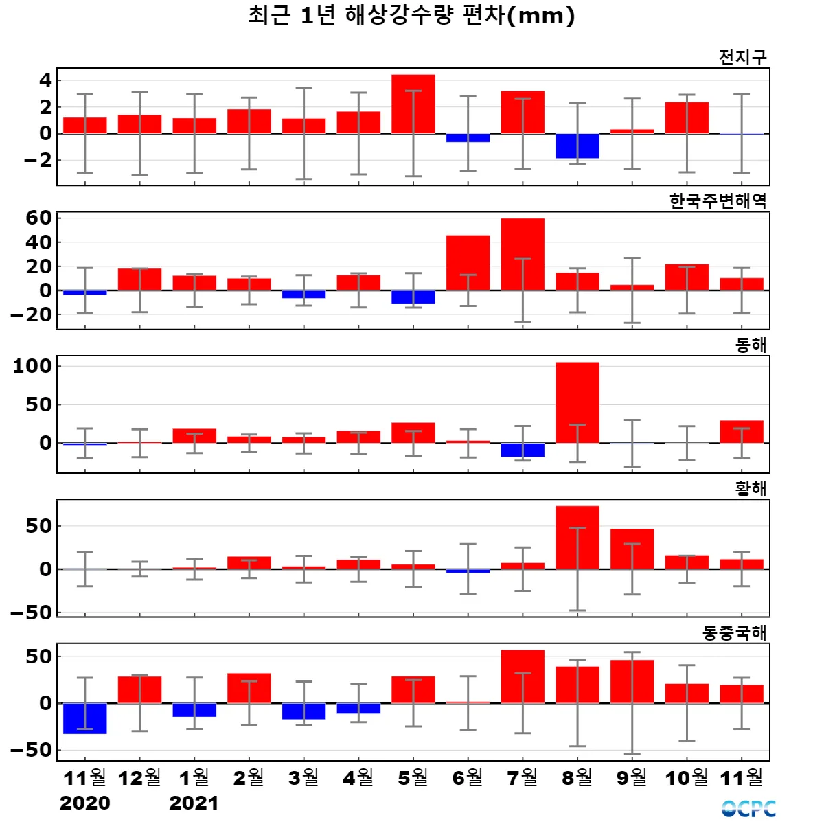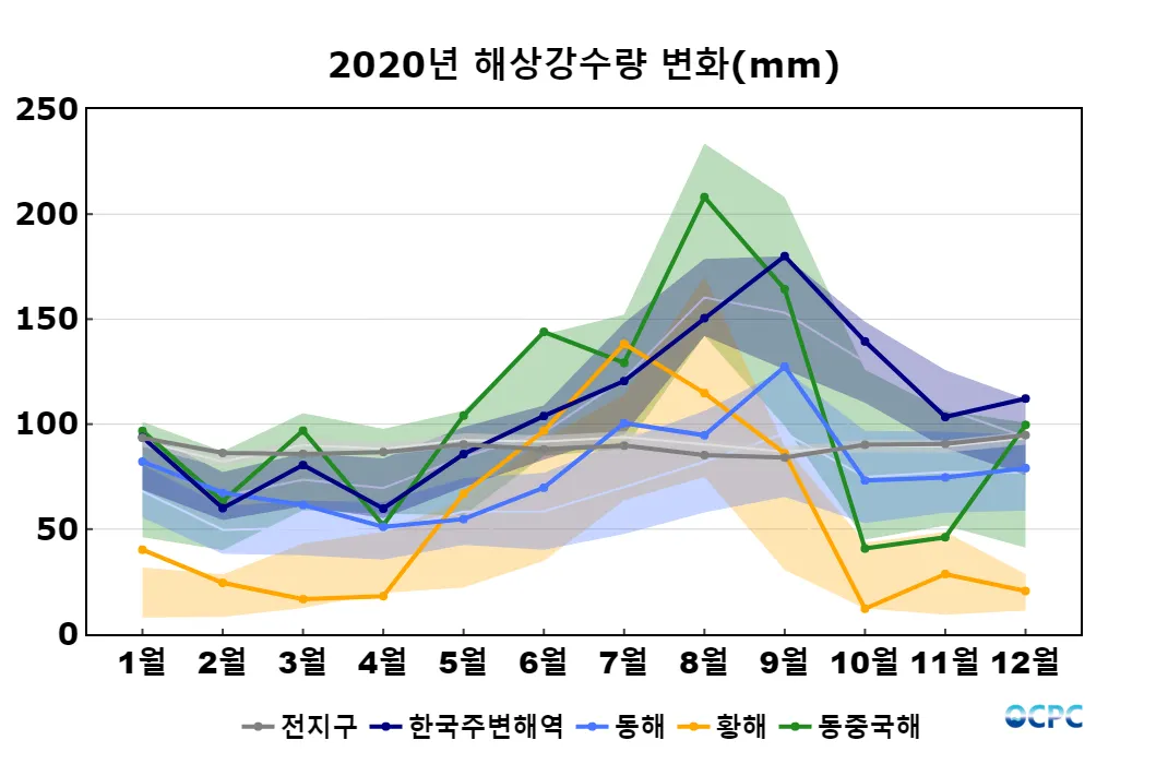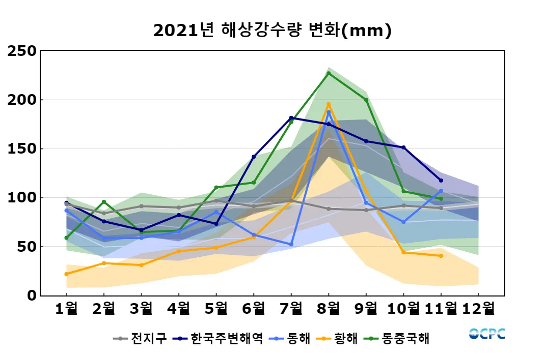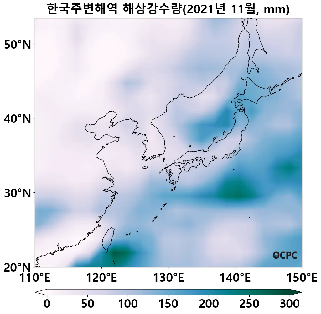 전지구, 한국주변해역, 황해, 동중국해의 11월 해상강수량은 평년과 비슷했으며, 동해는 평년보다 많았습니다.