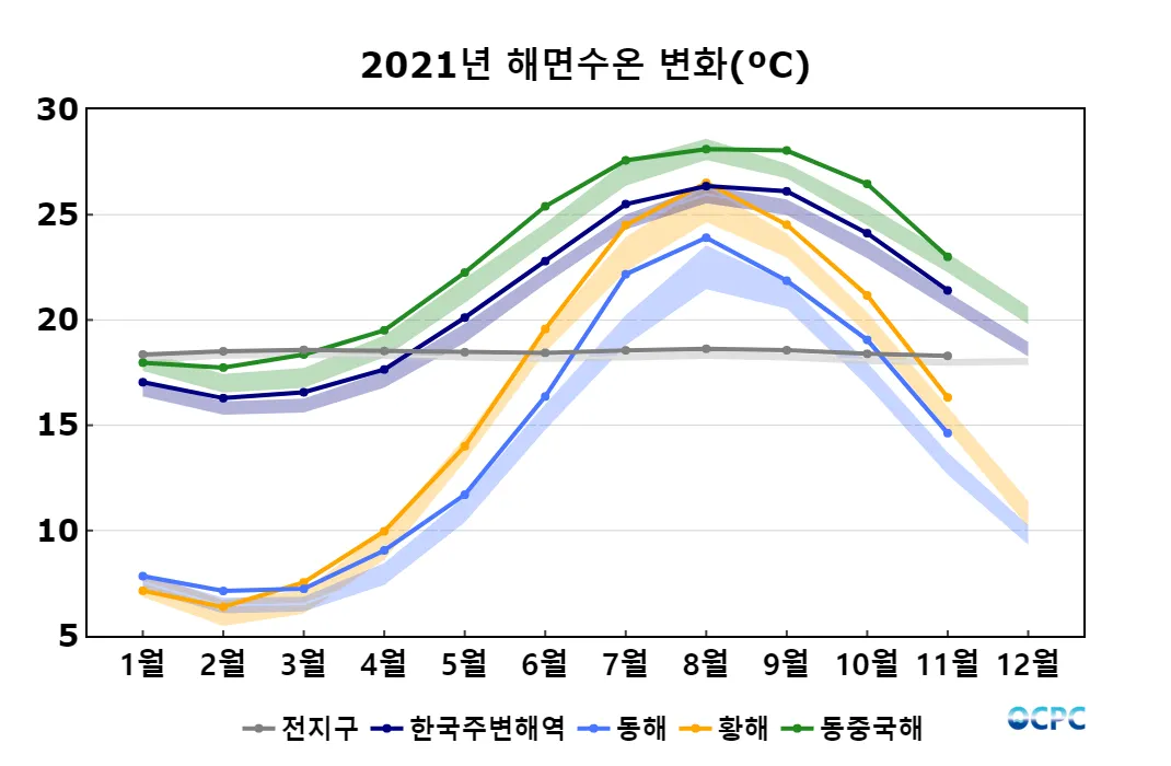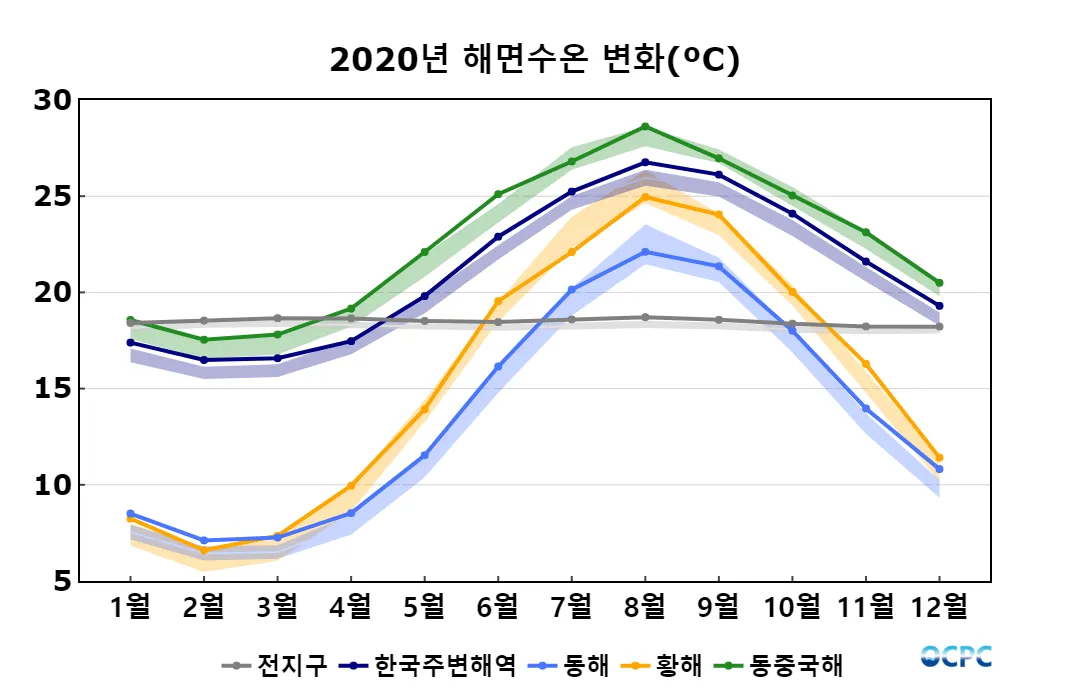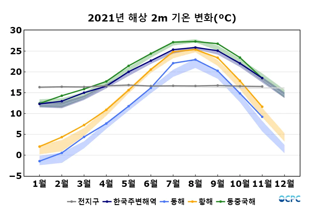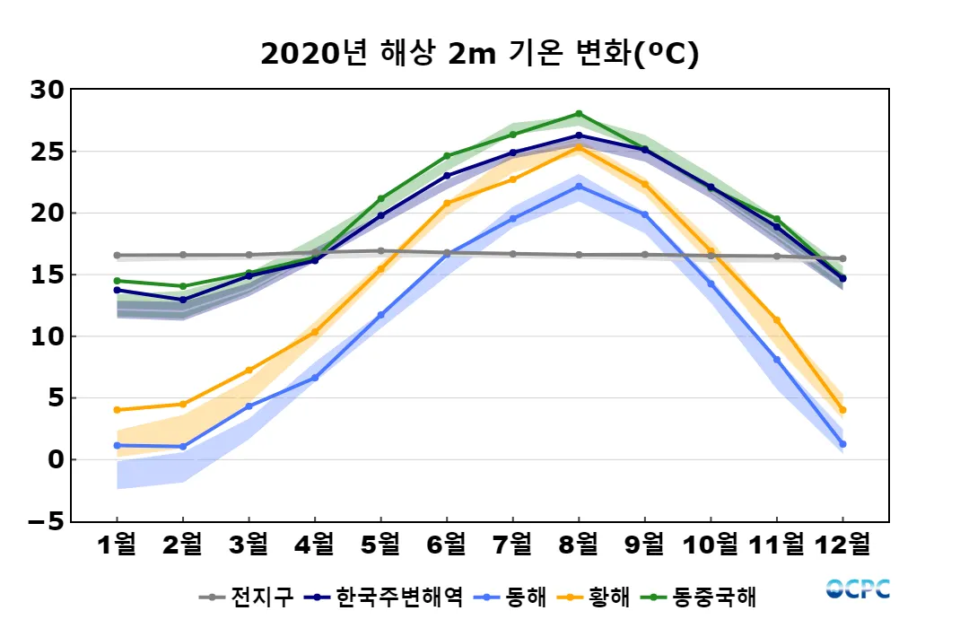 전지구, 동해, 황해의 해상기온은 평년보다 높았으며, 한국주변해역, 동중국해는 평년과 비슷했습니다.