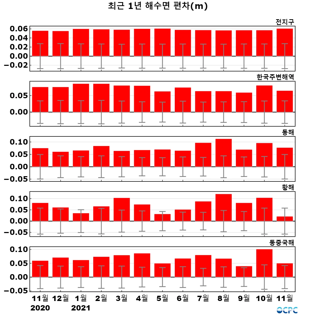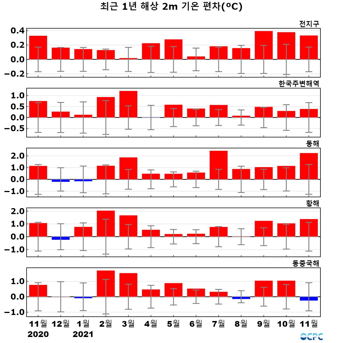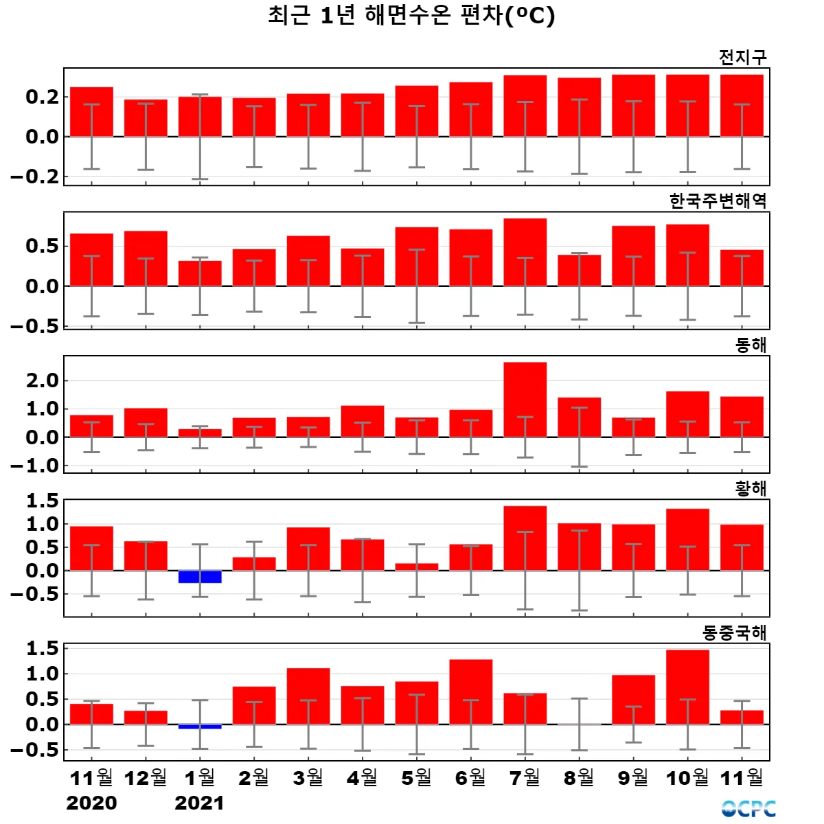 전지구, 동해, 황해의 해상기온은 평년보다 높았으며, 한국주변해역, 동중국해는 평년과 비슷했습니다.