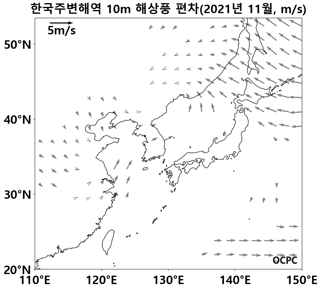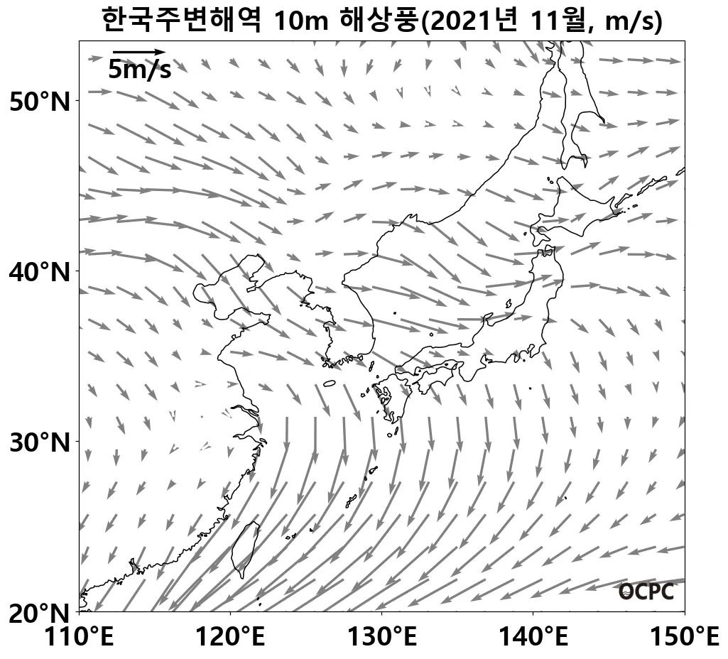 최근 30년 동안 한국주변해역, 동해, 동중국해의 11월 해상풍속은 10년에 0.1m/s씩 감소하는 추세이며, 황해는 10년에 0.1m/s씩 증가하는 추세입니다.