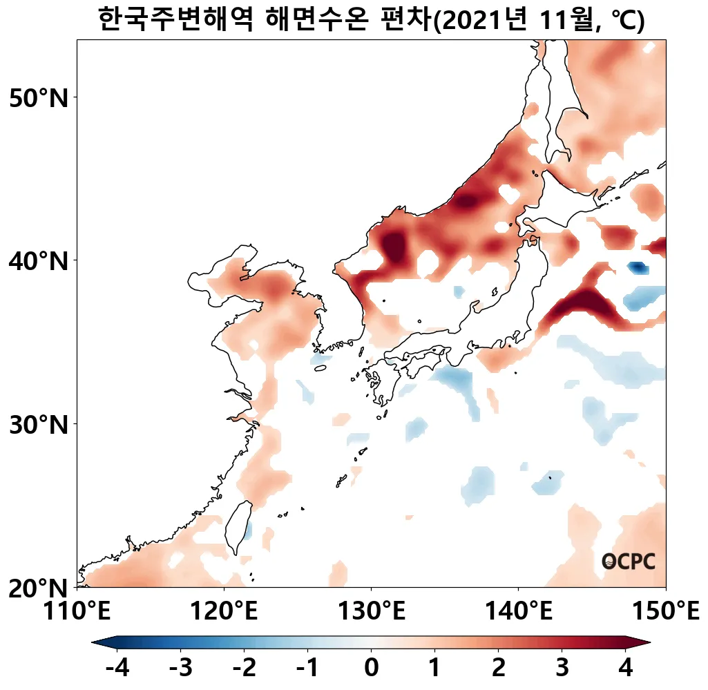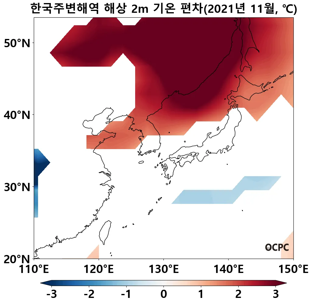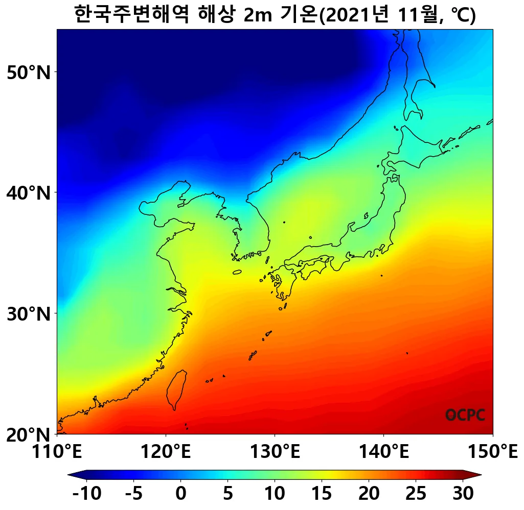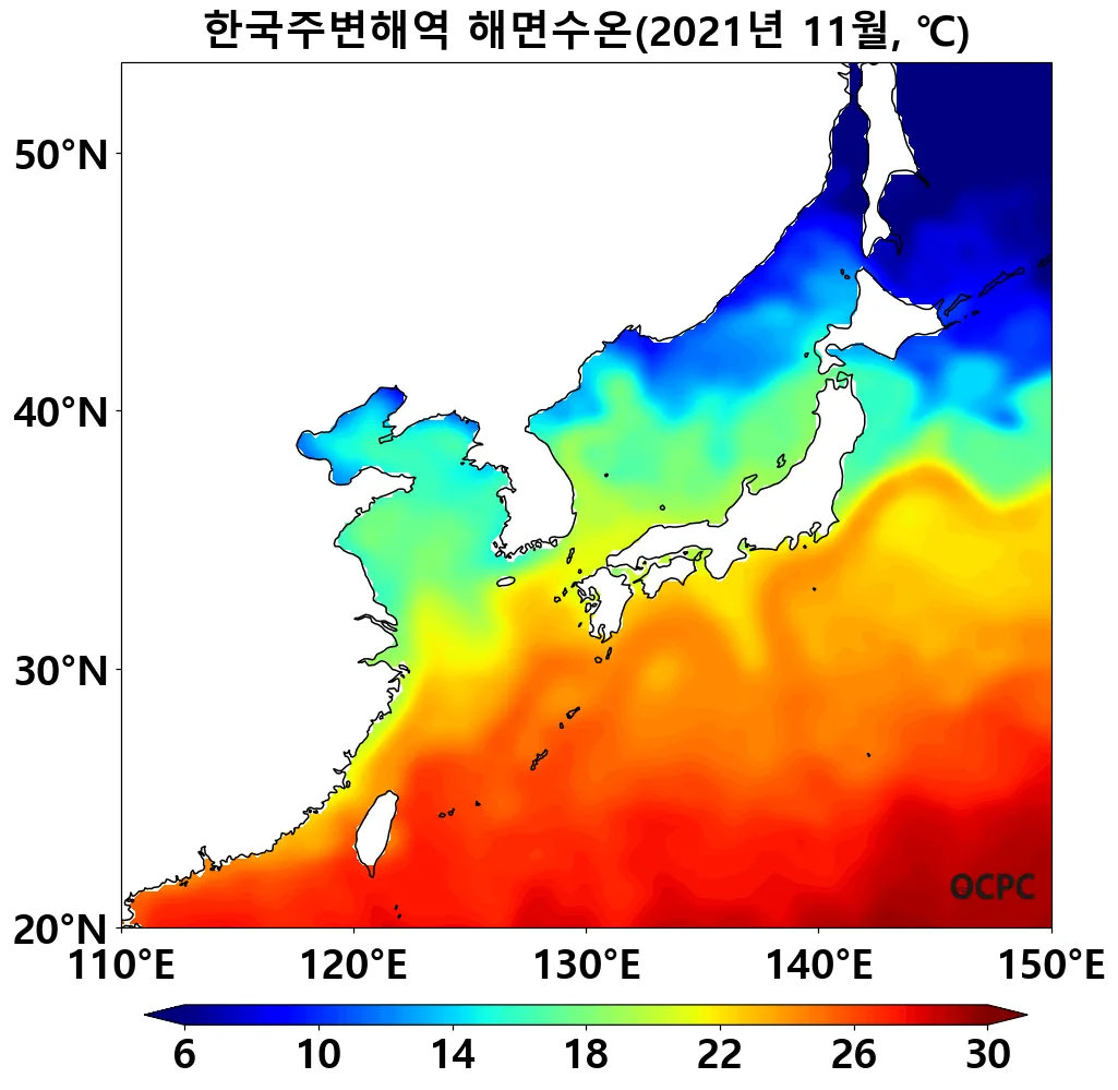 전지구 및 한국주변해역 평균 해면수온은 평년보다 높았으며, 특히 동해와 황해는 지난 30년 11월 중 가장 높았습니다