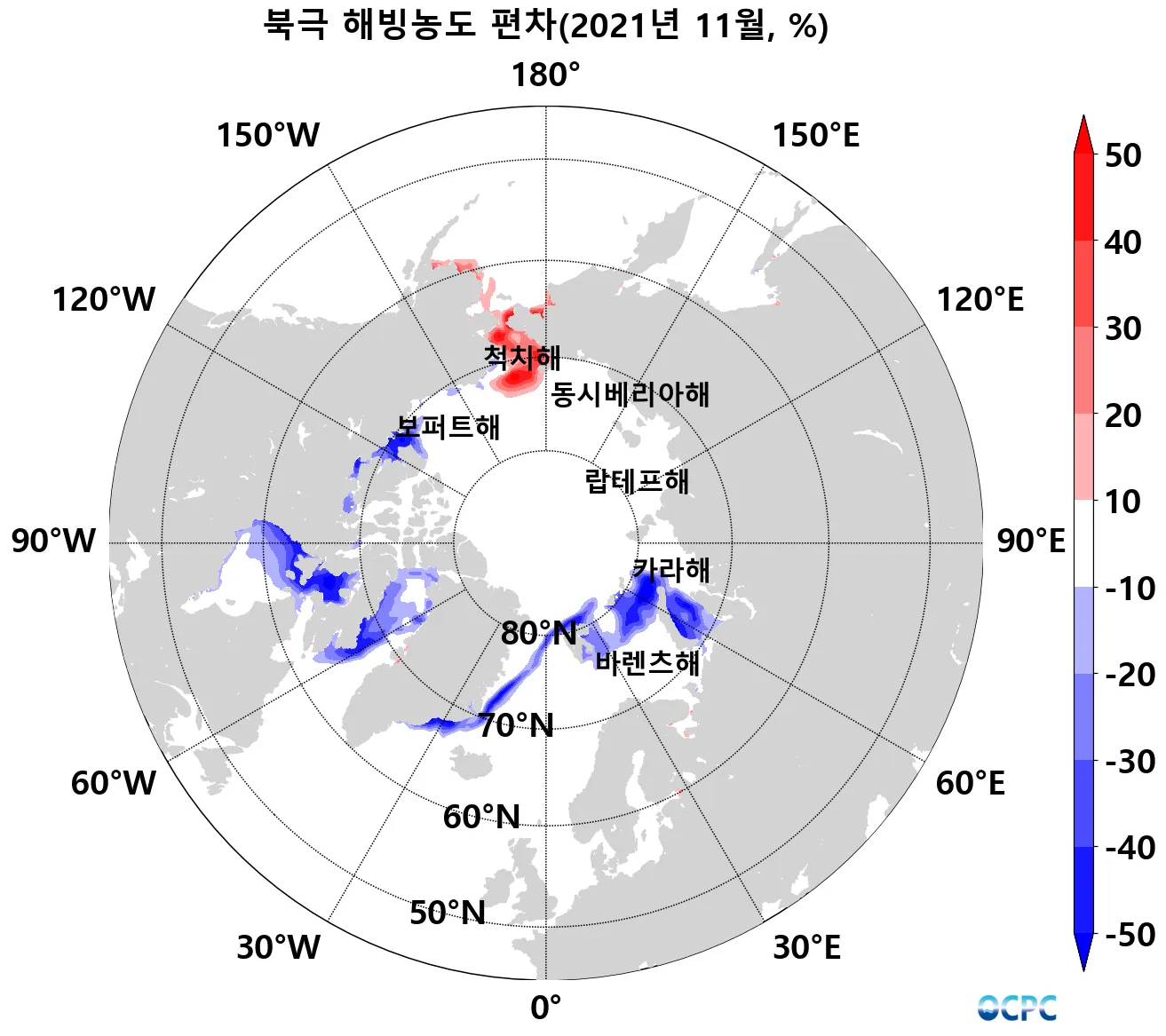 공간적으로는 척치해와 베링해에서 해빙면적이 평년보다 증가했으나 나머지 해역에서는 평년보다 감소했습니다.