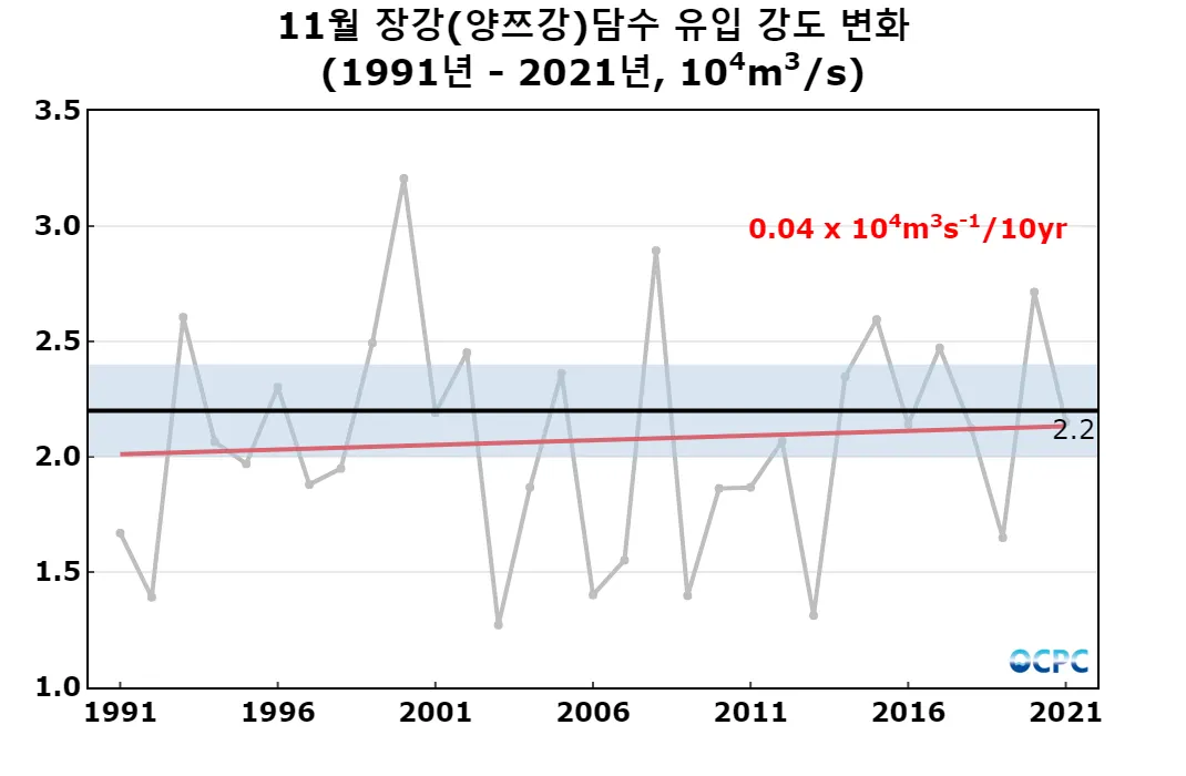 최근 30년 11월 장강 담수 유입 강도는 10년에 약 400m³/s씩 (한달간 유입된 담수량으로 환산하면 10년에 약 1기가톤씩) 증가하는 추세입니다.