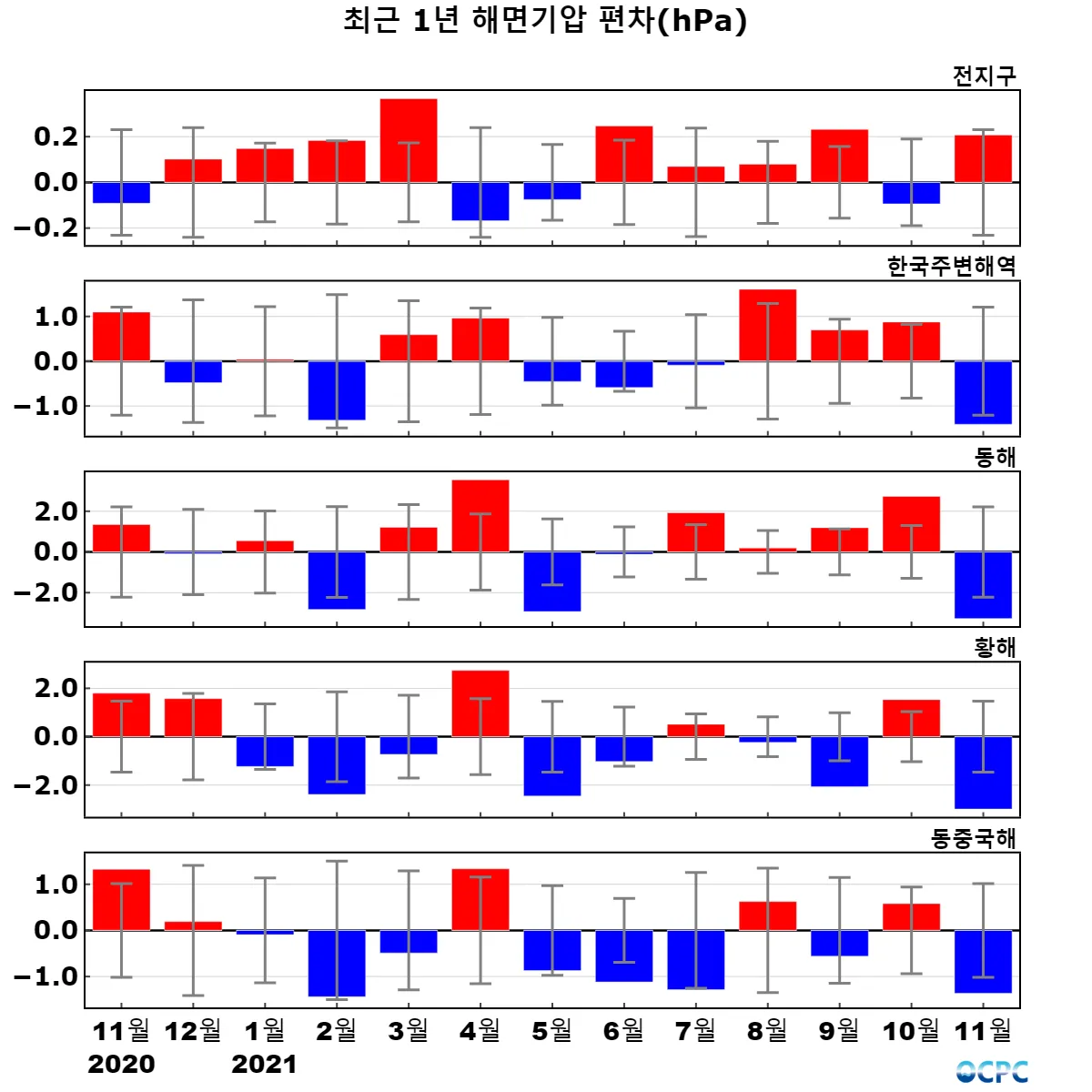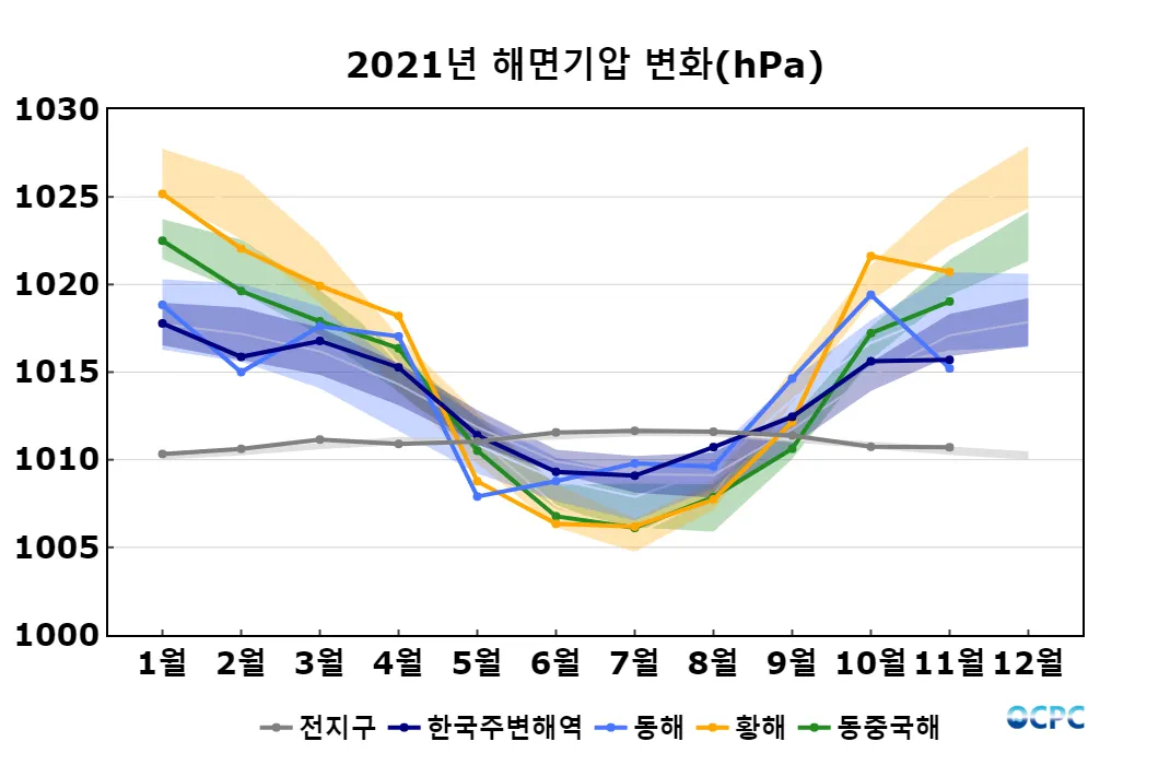 전지구 평균 해면기압은 평년과 비슷했으며, 한국주변해역, 동해, 황해, 동중국해는 평년보다 낮았습니다.
