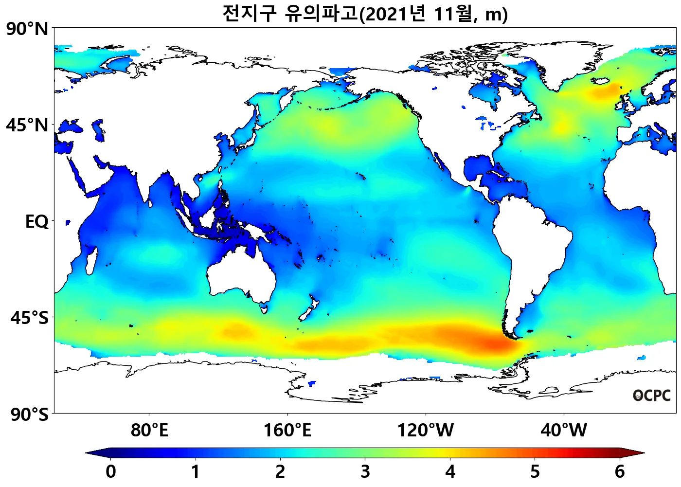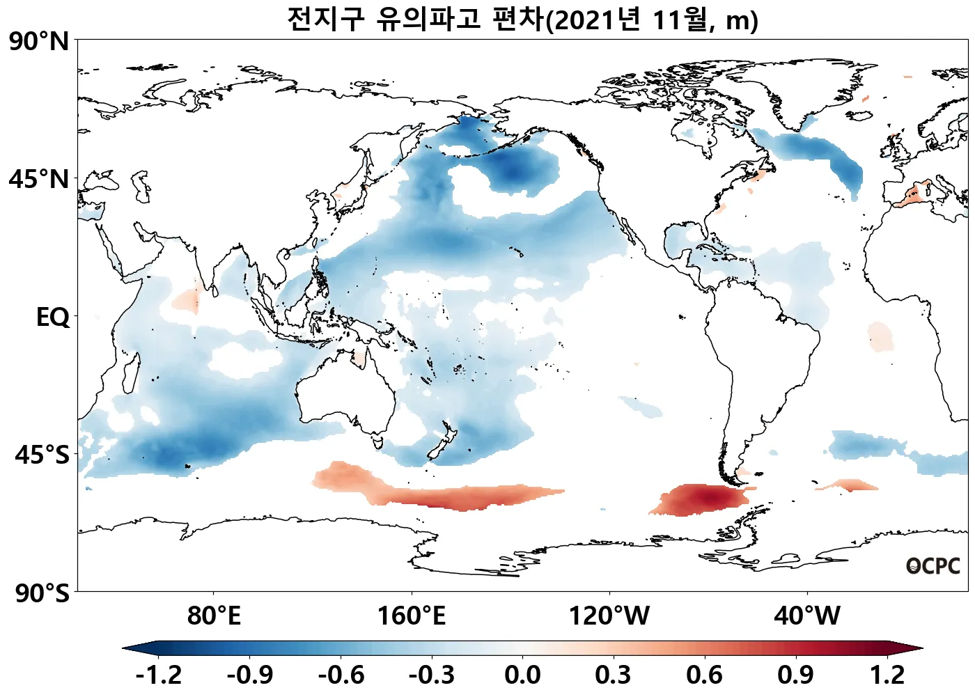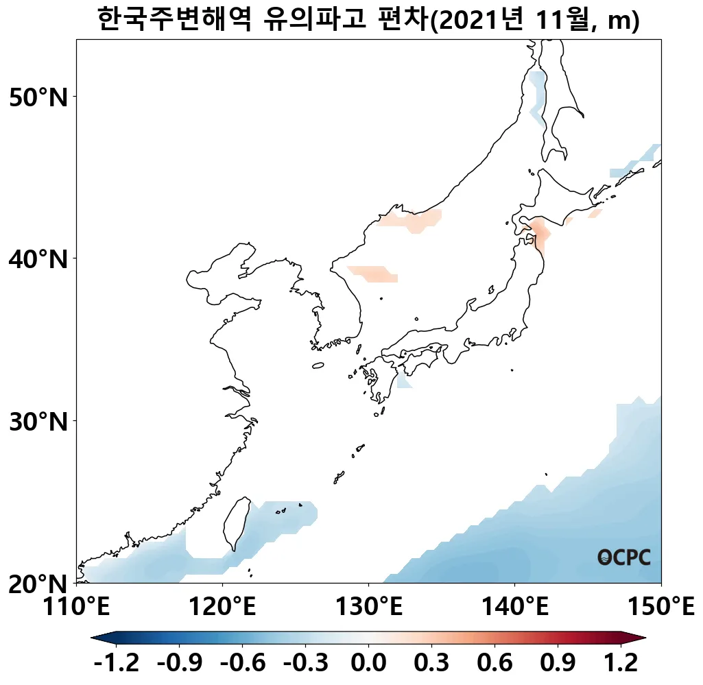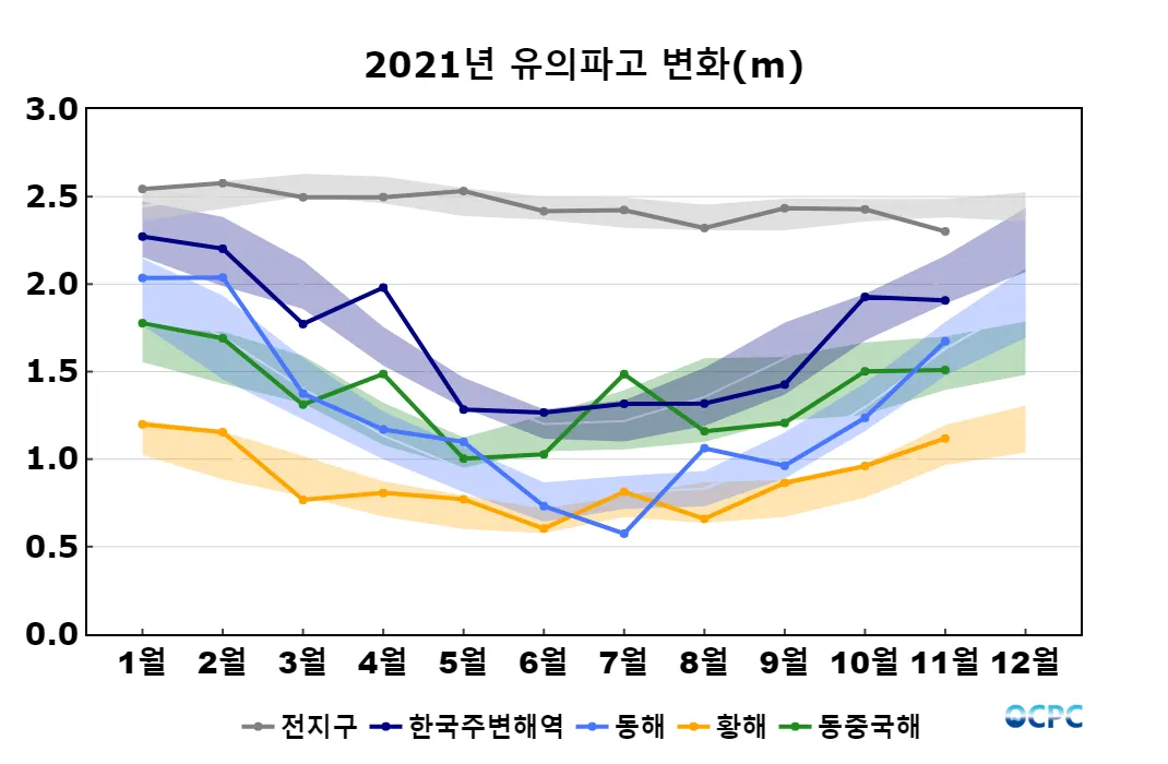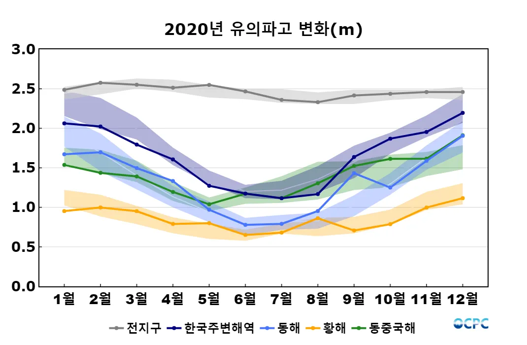 전지구 평균 유의파고는 평년보다 낮았으며, 한국주변해역, 동해, 황해, 동중국해는 평년과 비슷했습니다.