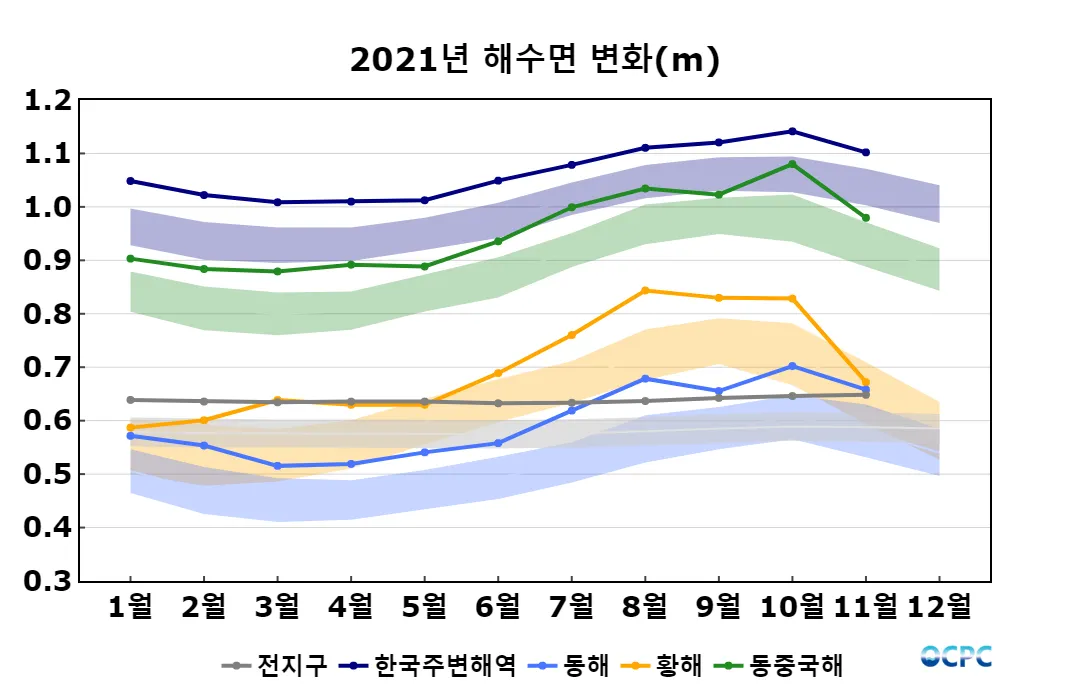 전지구 및 한국주변해역 평균 해수면은 평년보다 높았으며, 황해는 평년과 비슷했습니다.