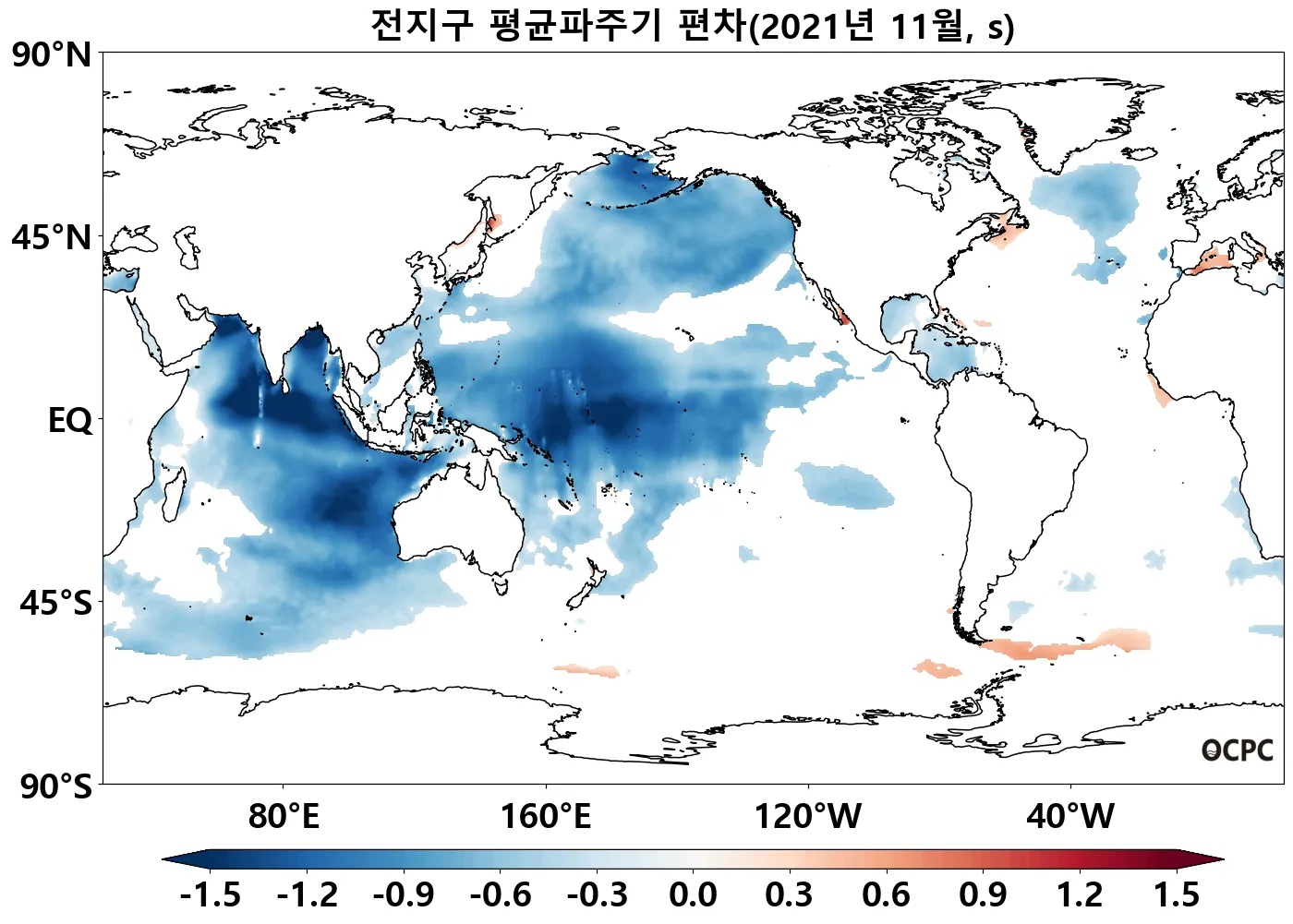 최근 30년 동안 11월의 전지구 및 한국주변해역의 평균파주기는 10년에 0.1초씩 감소하는 추세입니다.