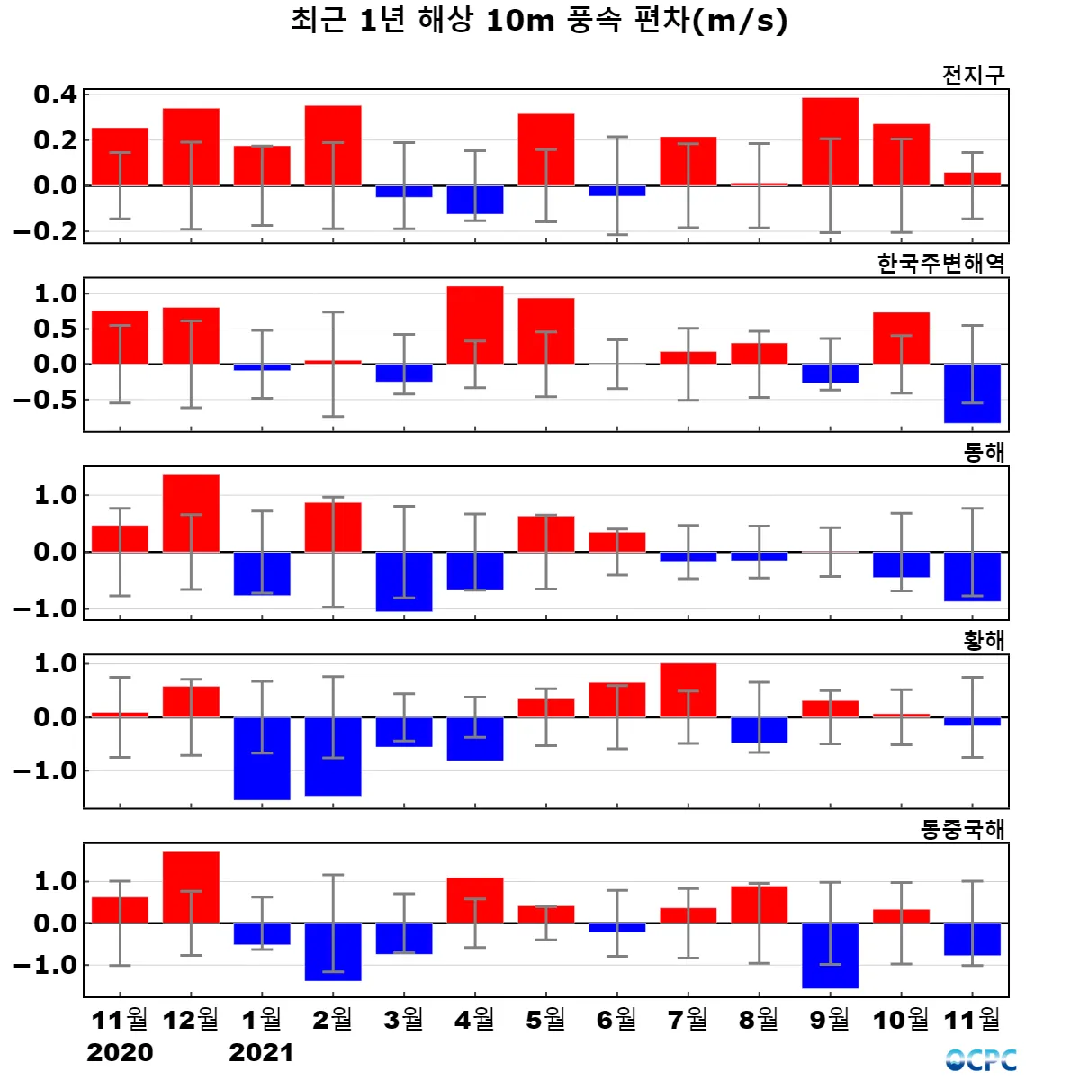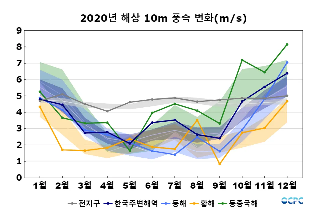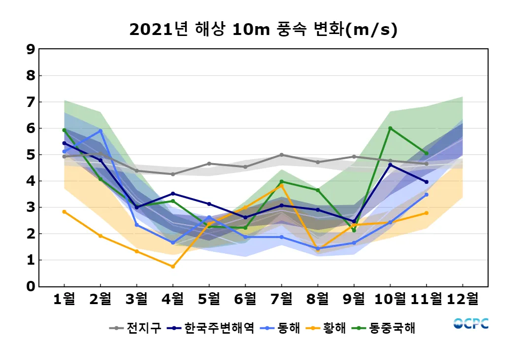 전지구, 황해, 동중국해의 해상풍속은 평년과 비슷했으며, 한국주변해역, 동해는 평년보다 약했습니다.