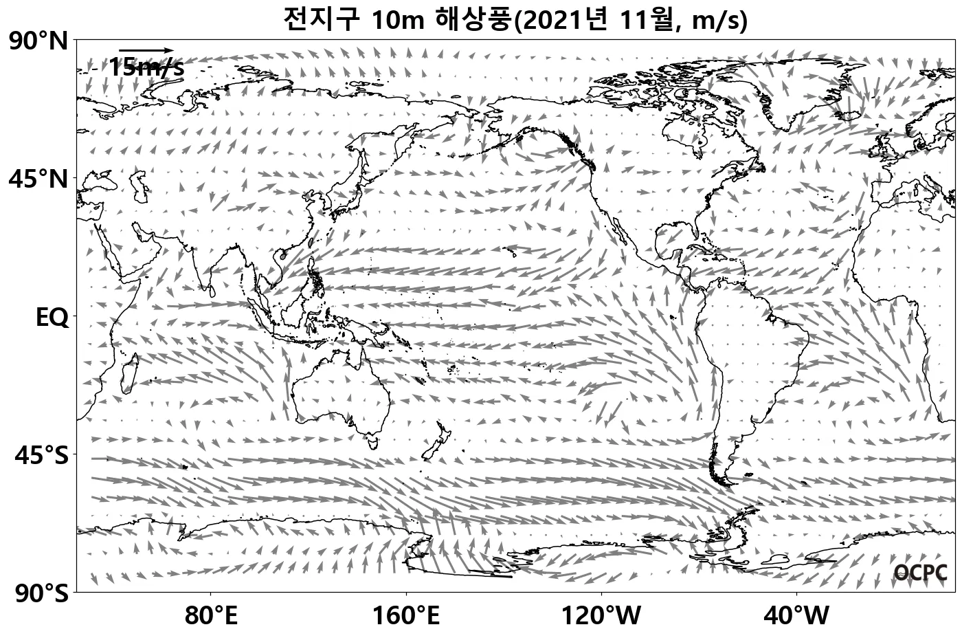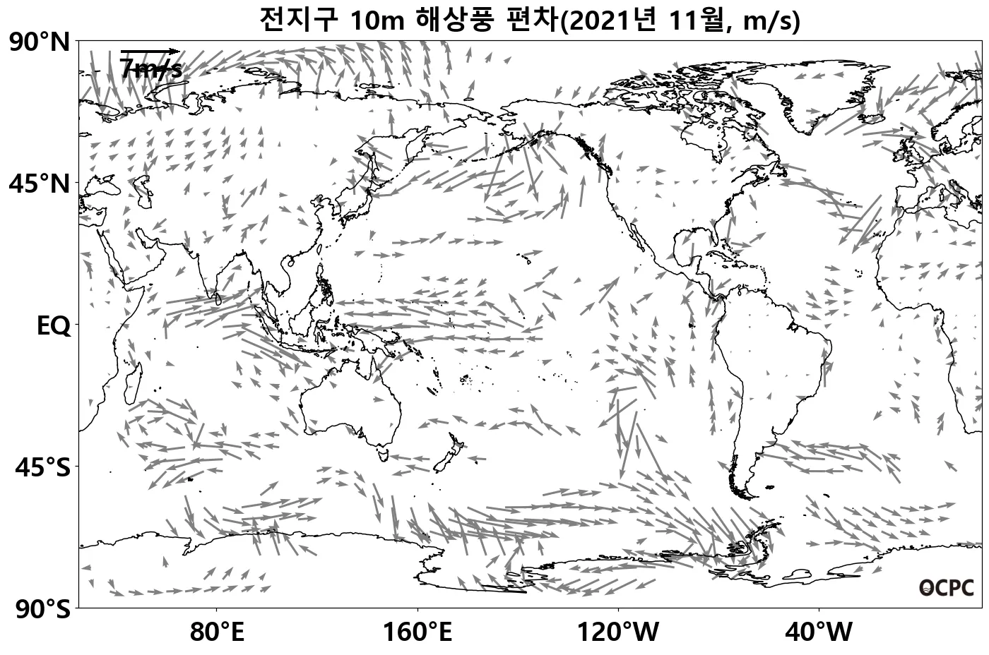 전지구 해상풍속은 평년(4.6m/s)과 비슷했으며, 열대 서태평양 해역의 동풍과 열대 인도양 해역의 서풍이 평년보다 강했습니다.