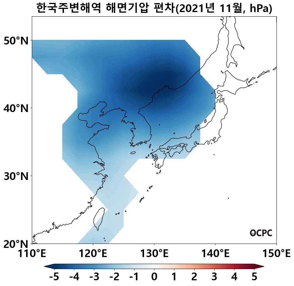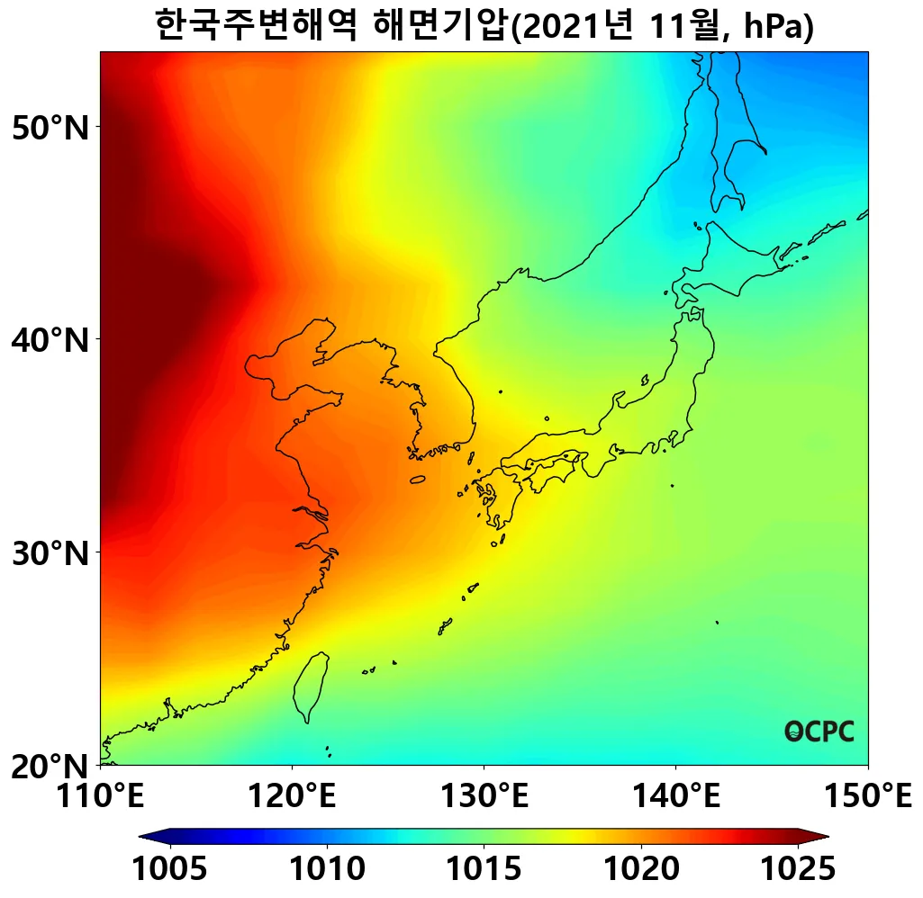최근 30년 동안 한국주변해역, 동해, 황해, 동중국해의 11월 해면기압은 10년에 0.2~0.3hPa씩 감소하는 추세입니다.
