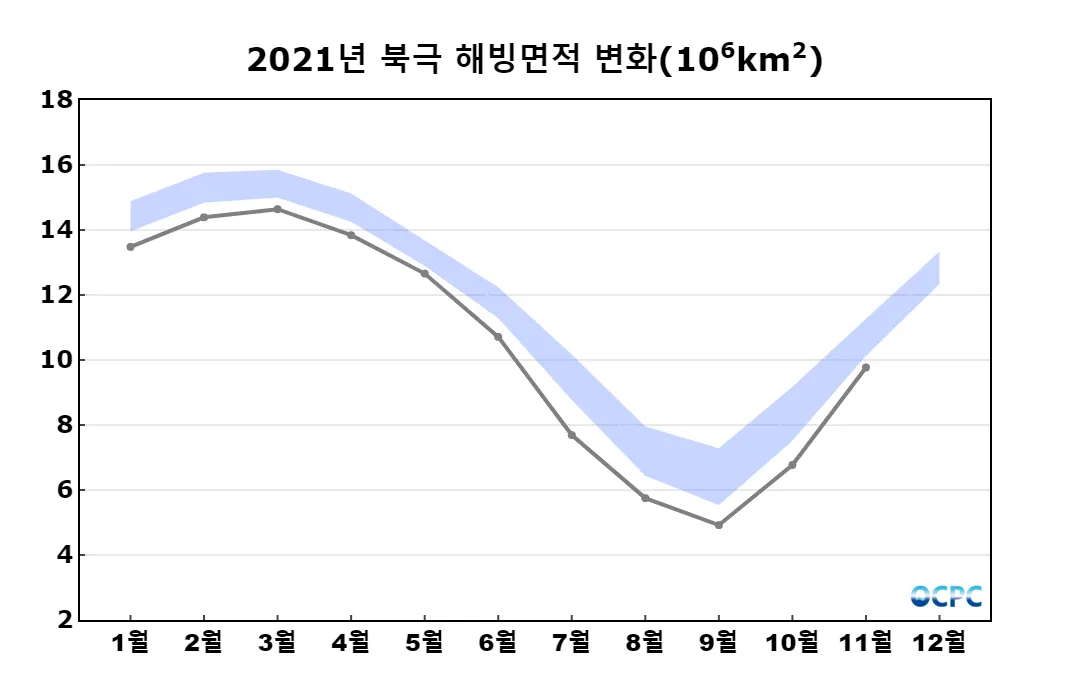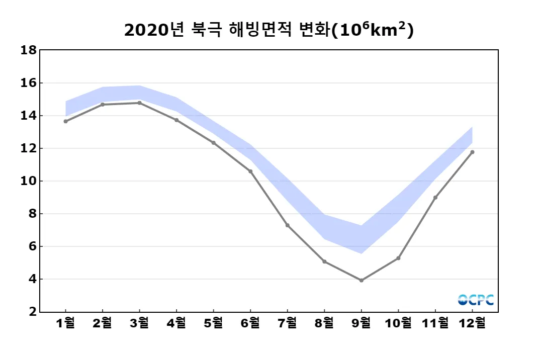 북극 해빙면적은 977만km²로 평년(1,070만km²)보다 93만km²(8.7%) 작았습니다.
