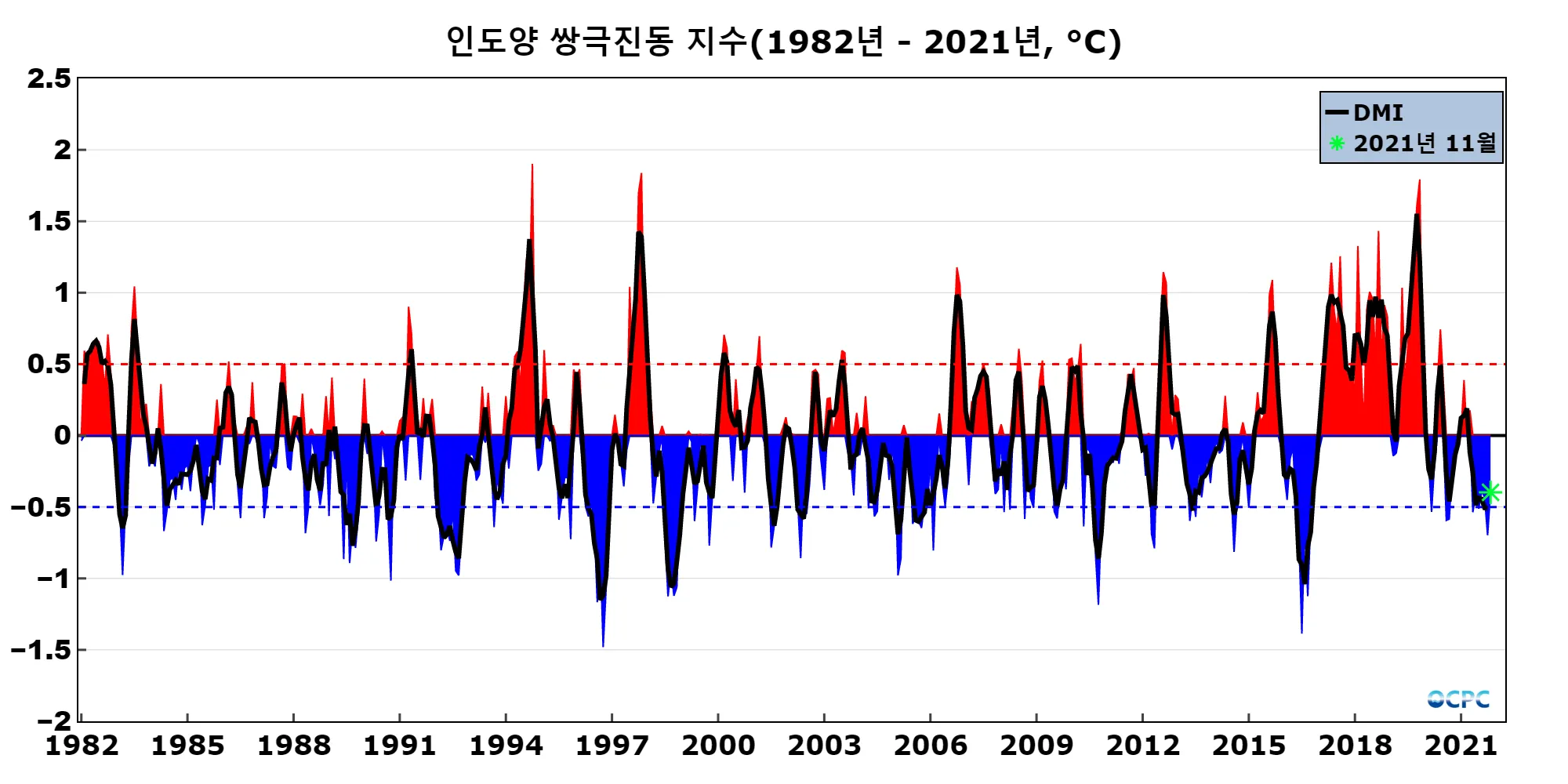 인도양 쌍극진동 지수 DMI (Dipole Mode Index)는 WTIO의 평년 대비 편차에서 SETIO의 평년 대비 편차를 뺀 값으로 OCPC에서는 월평균 지수(채색부분)를 3개월 이동평균하여 나타낸 지수(검정선)가 0.5보다 크면 양의 상태로, -0.5보다 작으면 음의 상태로 판정합니다.