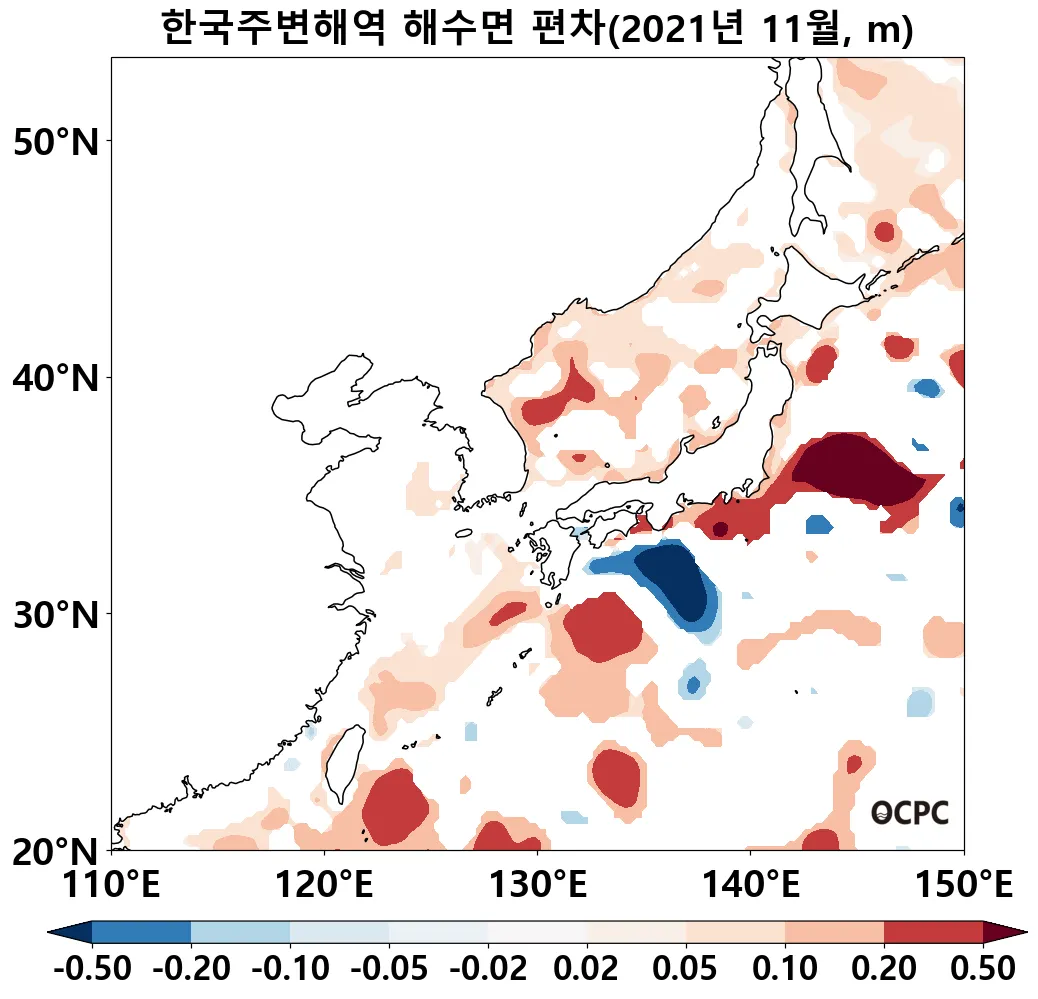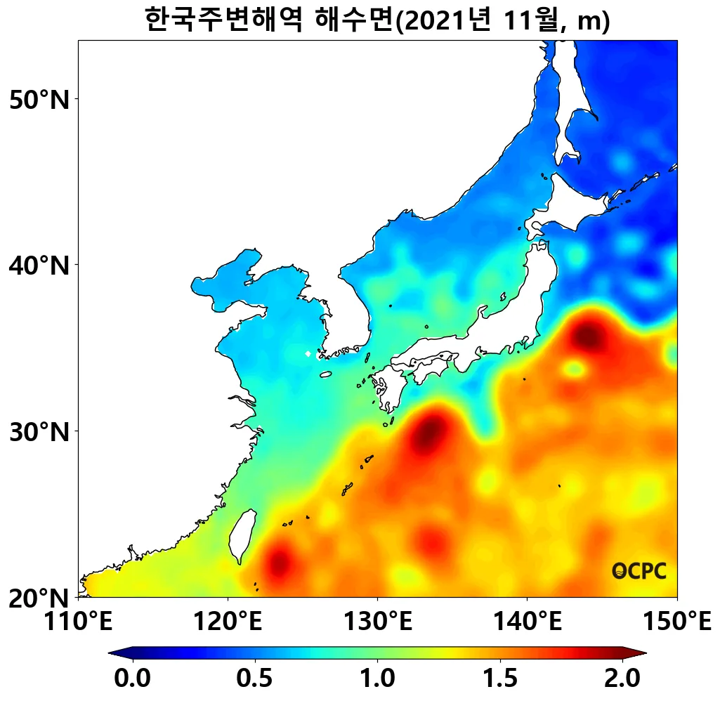 최근 28년 동안 11월의 전지구와 한국주변해역의 해수면은 10년에 3.4~3.5cm씩 상승하는 추세이며, 동해, 황해, 동중국해의 상승률은 3.6~4.8cm로서 그 중 동해가 가장 높습니다.