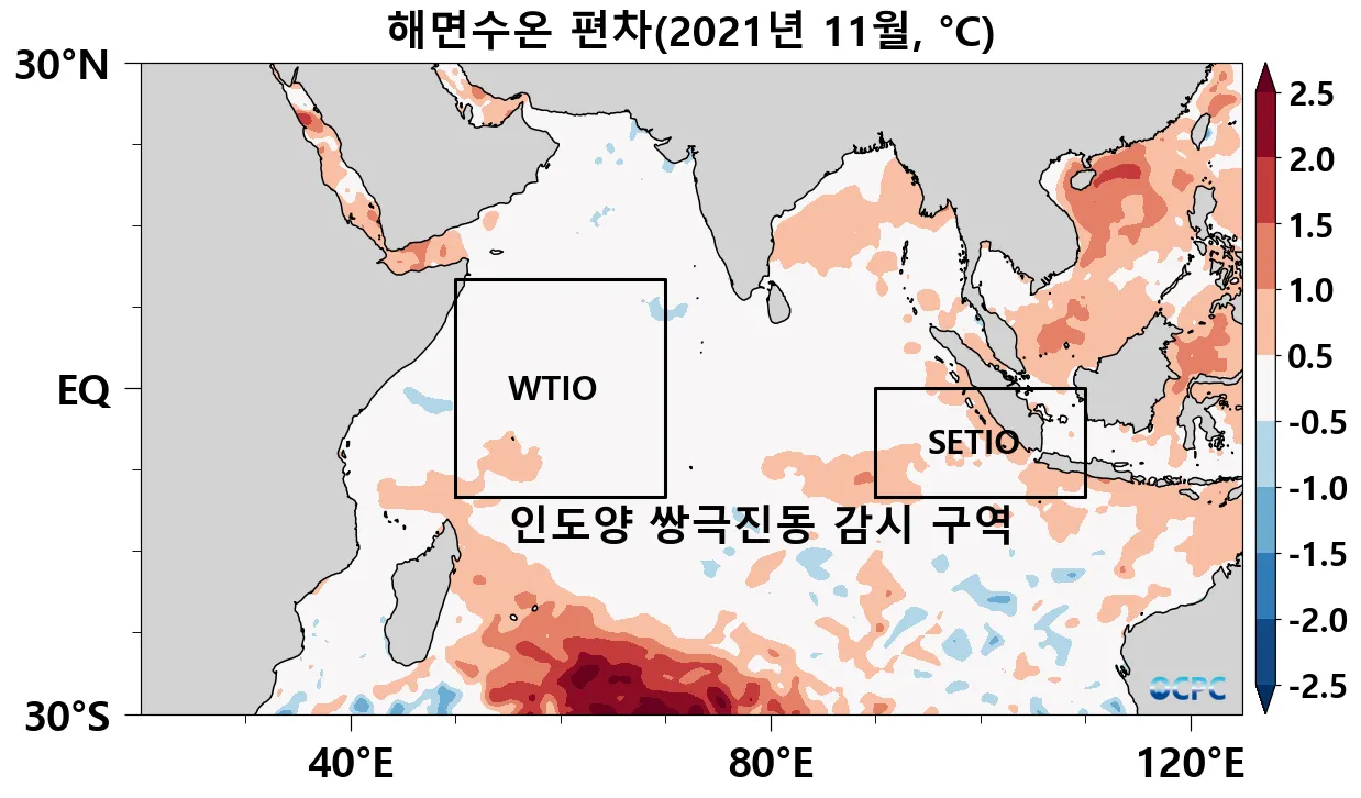 2021년 11월 평균 해면수온의 평년 대비 편차 (숫자가 표시된 사각형은 인도양 쌍극진동 감시구역으로 각각 WTIO(열대서인도양), SETIO(열대 남동인도양) 해역이며, DMI 지수는 WTIO의 평년 대비 편차에서 SETIO의 평년 대비 편차를 뺀 값임)