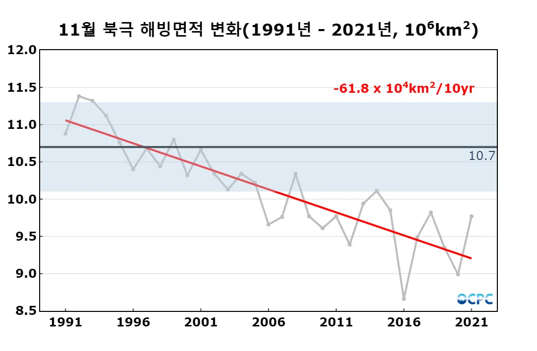 최근 30년 동안 11월 북극 해빙면적의 경향은 10년에 61.8만km² 정도의 감소 추세에 있습니다.