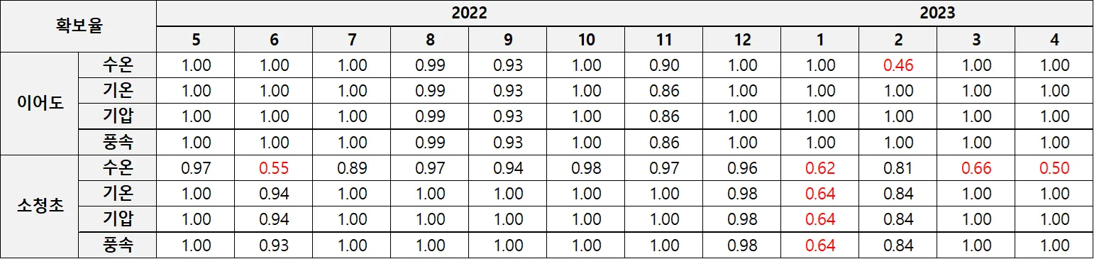 해양과학기지 관측요소별 관측자료 월별 확보율(2022-2023). 최대가 1.0이며 붉은색은 월 확보율 0.8(수온은 0.7) 미만인 자료로 분석에서 제외