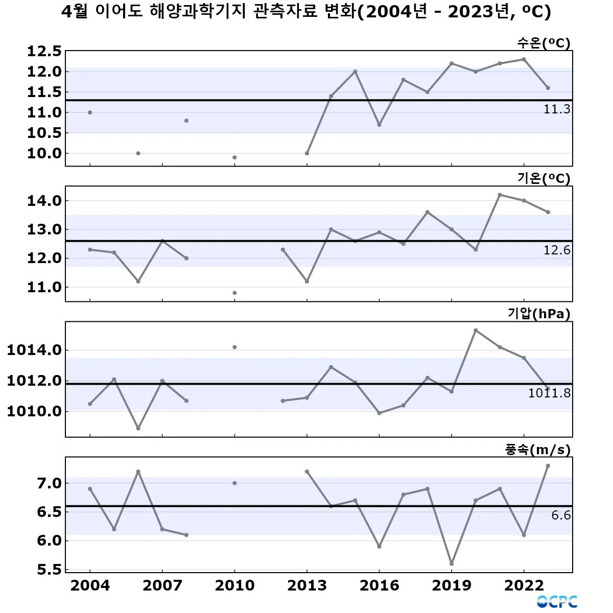 이어도 기지의 4월 평균 풍속은 2004-2023년 중 가장 컸습니다.