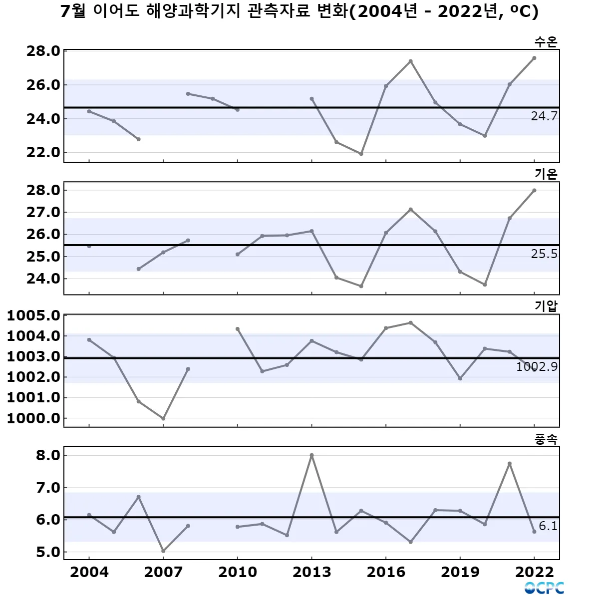 기압(해상 38.5m)은 최근 8년(2015~2022년) 7월 평균보다 1.7hPa 작았으며, 풍속(해상 10m)은 0.1m/s 강했으나 표준편차 구간에 속합니다.