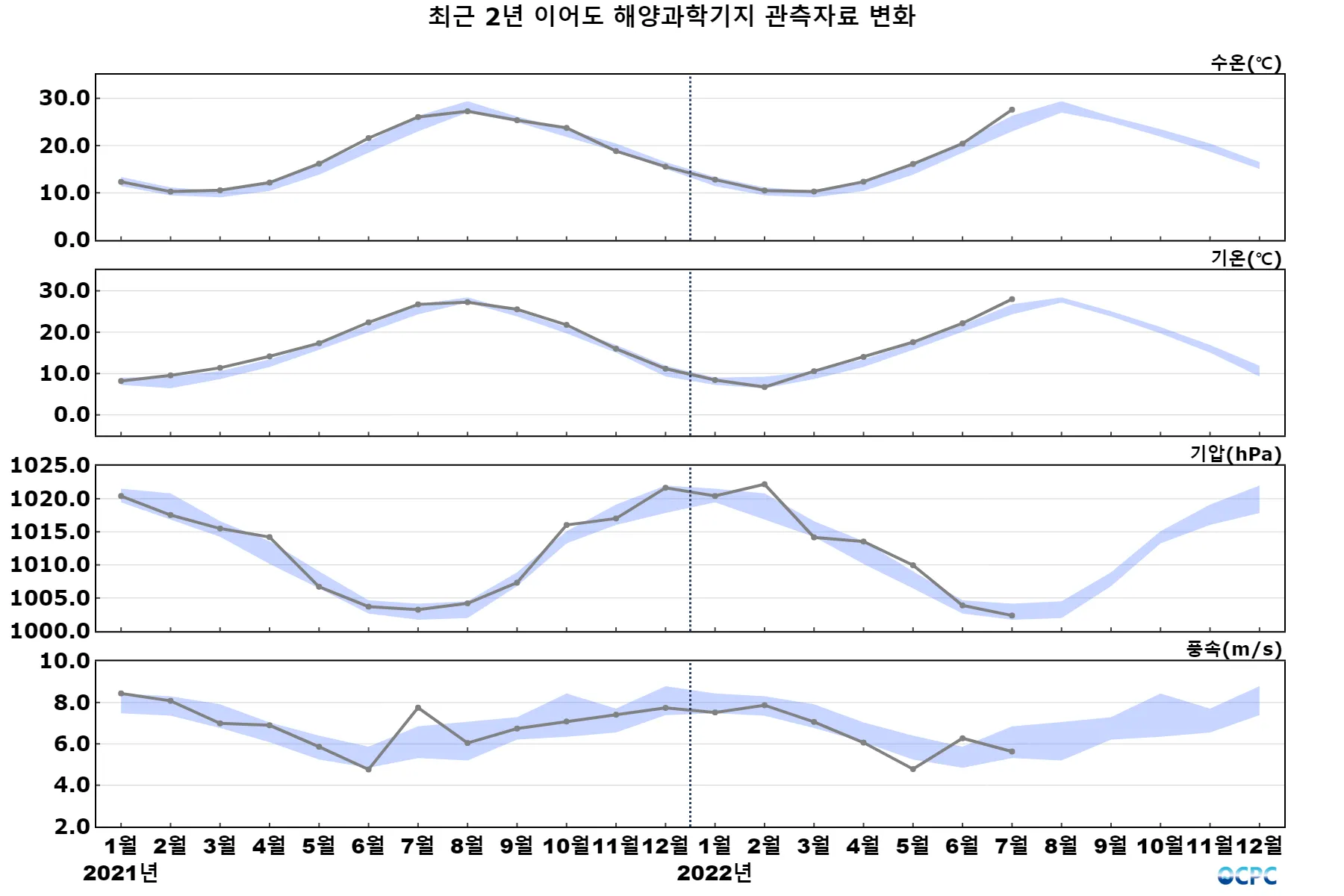 기압(해상 35.9m)은 관측기간(2004~2022년) 7월 평균에 비하여 0.6hPa 작았으며, 풍속(해상 10m)은 0.5m/s 작았지만 관측기간 표준편차 구간에 속합니다.