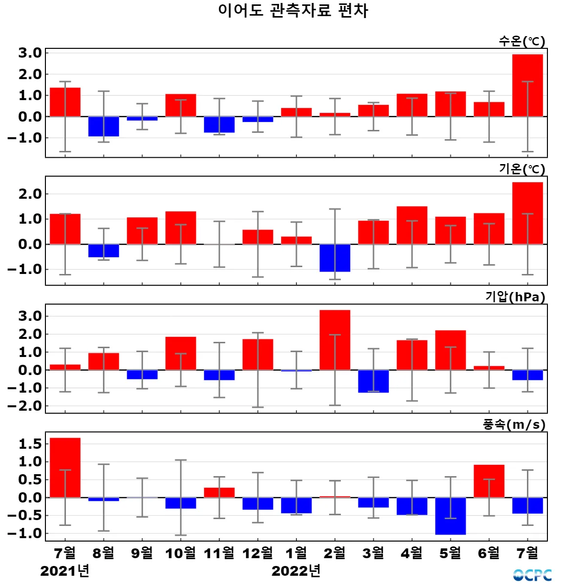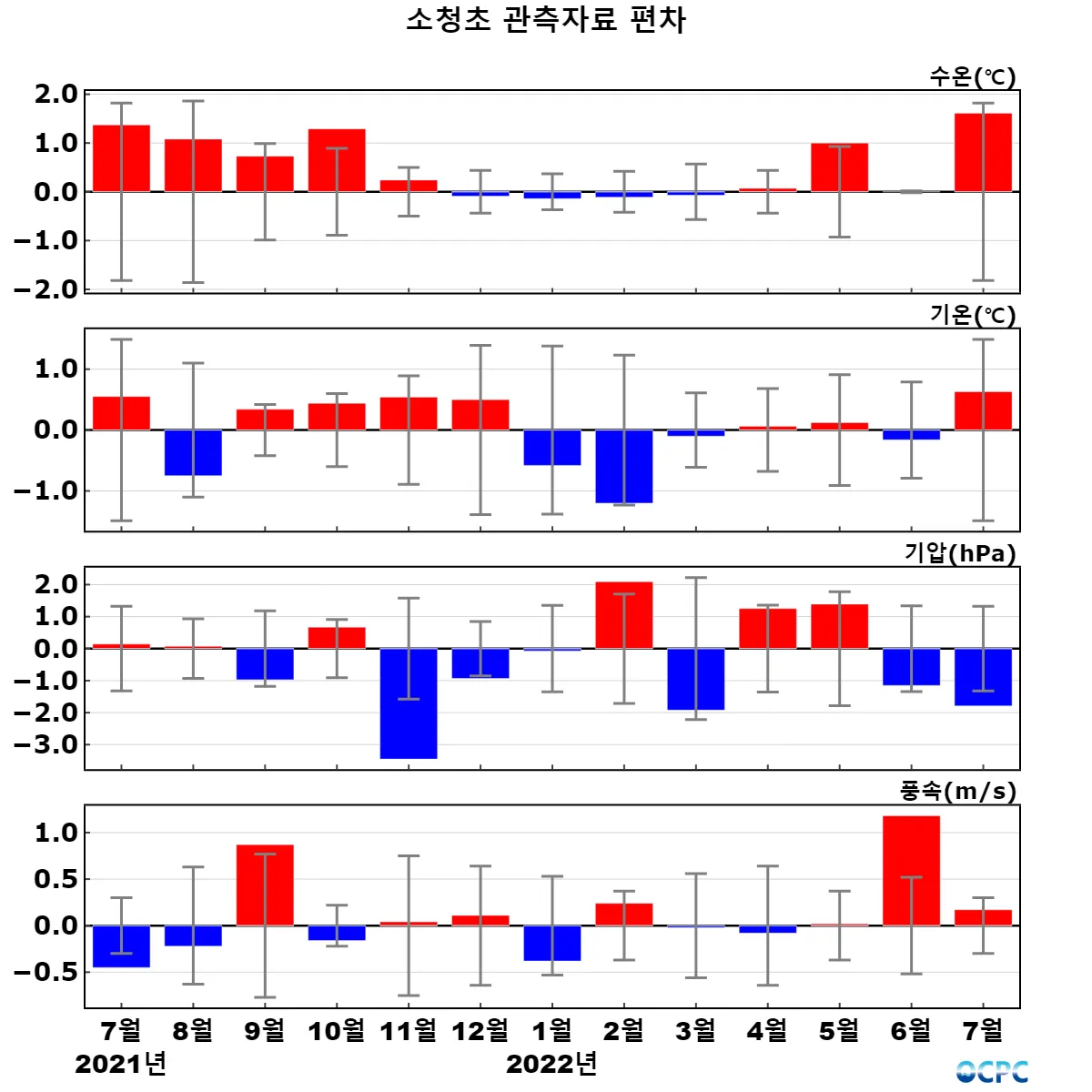 관측기간(2004~2022년) 월평균 대비 최근 13개월 편차 (세로 막대는 관측기간 중 월별 표준편차 구간) (수온은 수심 3m, 기온은 해상 42.1m, 기압은 해상 35.9m 값이며, 풍속은 해상 42.9m 관측값을 해상 10m 값으로 환산하였음)