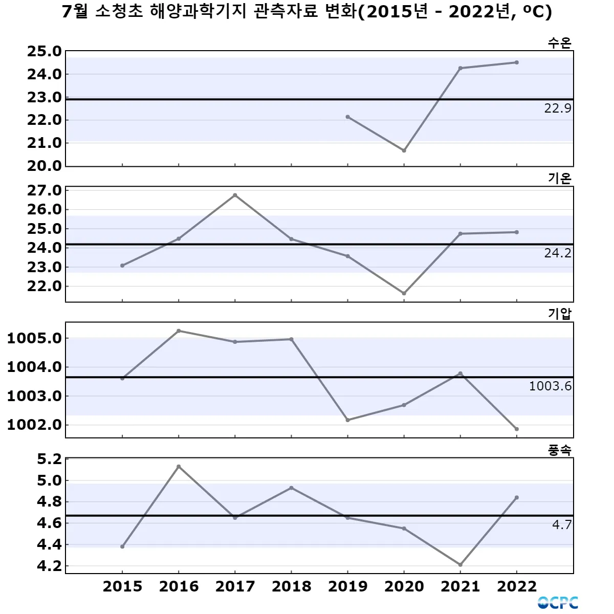 2022년 7월 평균 수온은 관측기간(2019~2022년, 4년) 7월 평균보다 1.6℃  높았으며, 기온은 최근 8년(2015~2022년) 7월 평균보다 0.6℃ 높았습니다.