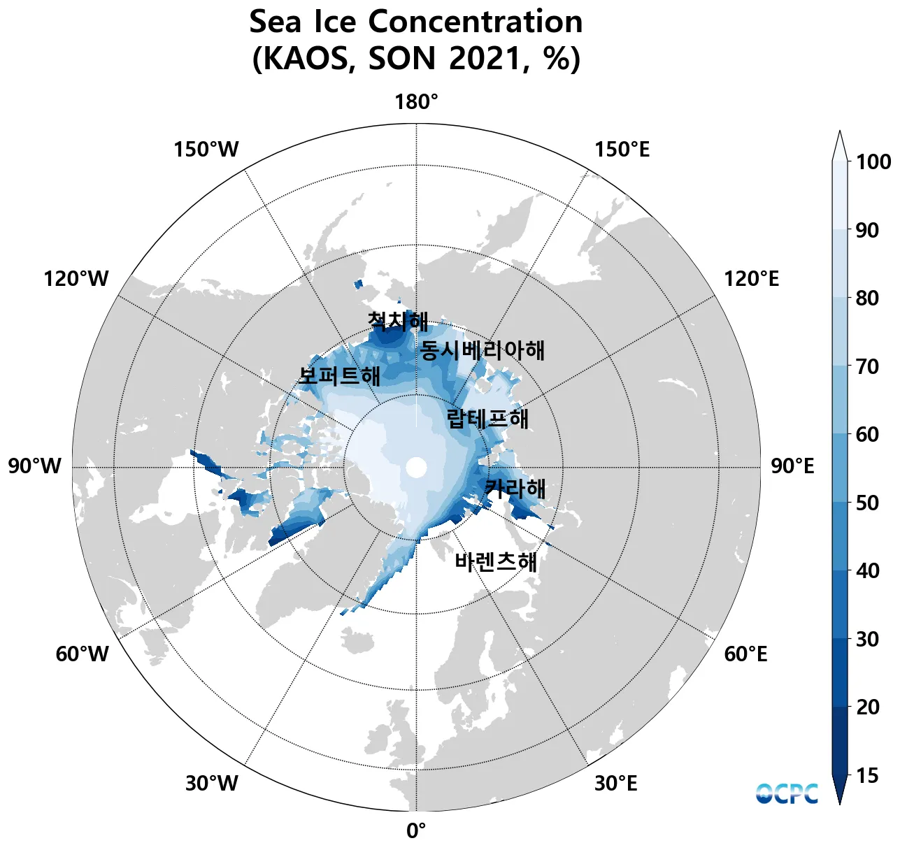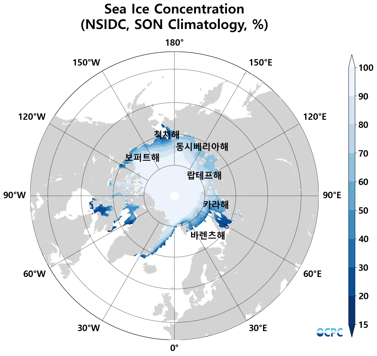 B. 북극 해빙농도(9~11월 평년평균, 15% 이상 해역)