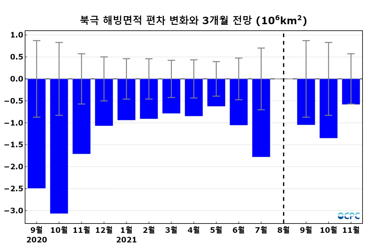 북극 해빙면적이 연중 최소인 9월의 면적은 536만 km² 로 예상되며, 지난 해 9월 면적(392만 km²)보다 144만 km² 큰(늘어난) 수치입니다.