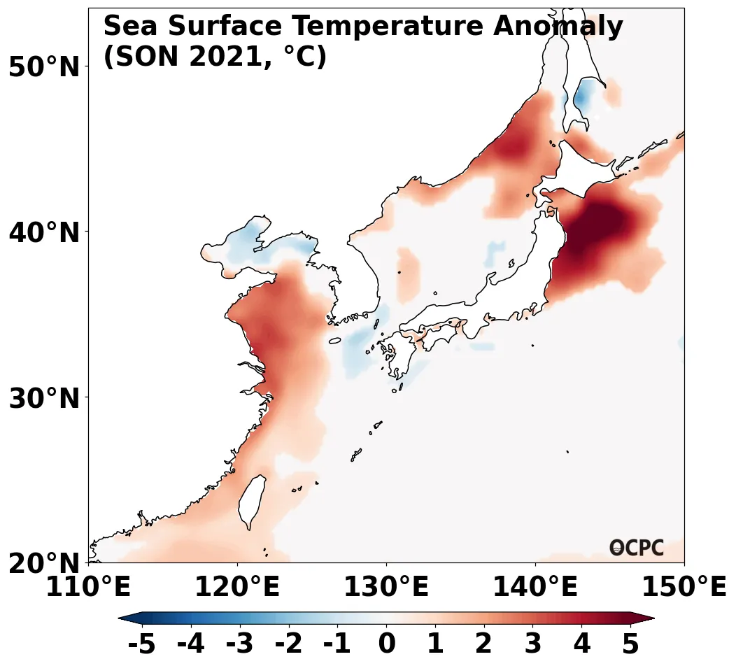 A-B. 한국주변해역 해상기온 편차 전망(2021년 9~11월 평균, 채색표시: 평년 표준편차 초과 해역)