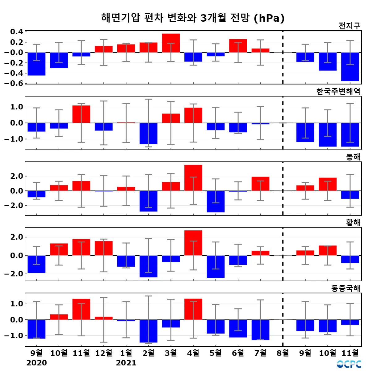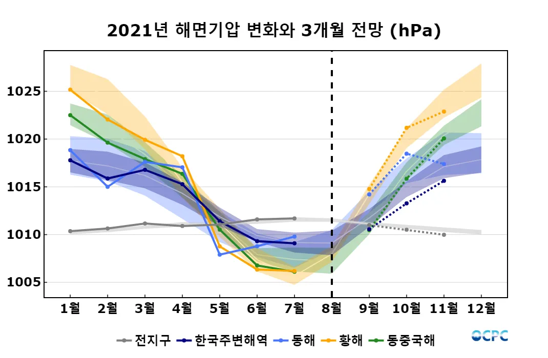전지구, 한국주변해역의 해면기압은 평년보다 낮겠으며, 동해, 황해, 동중국해는 평년과 비슷하겠습니다.