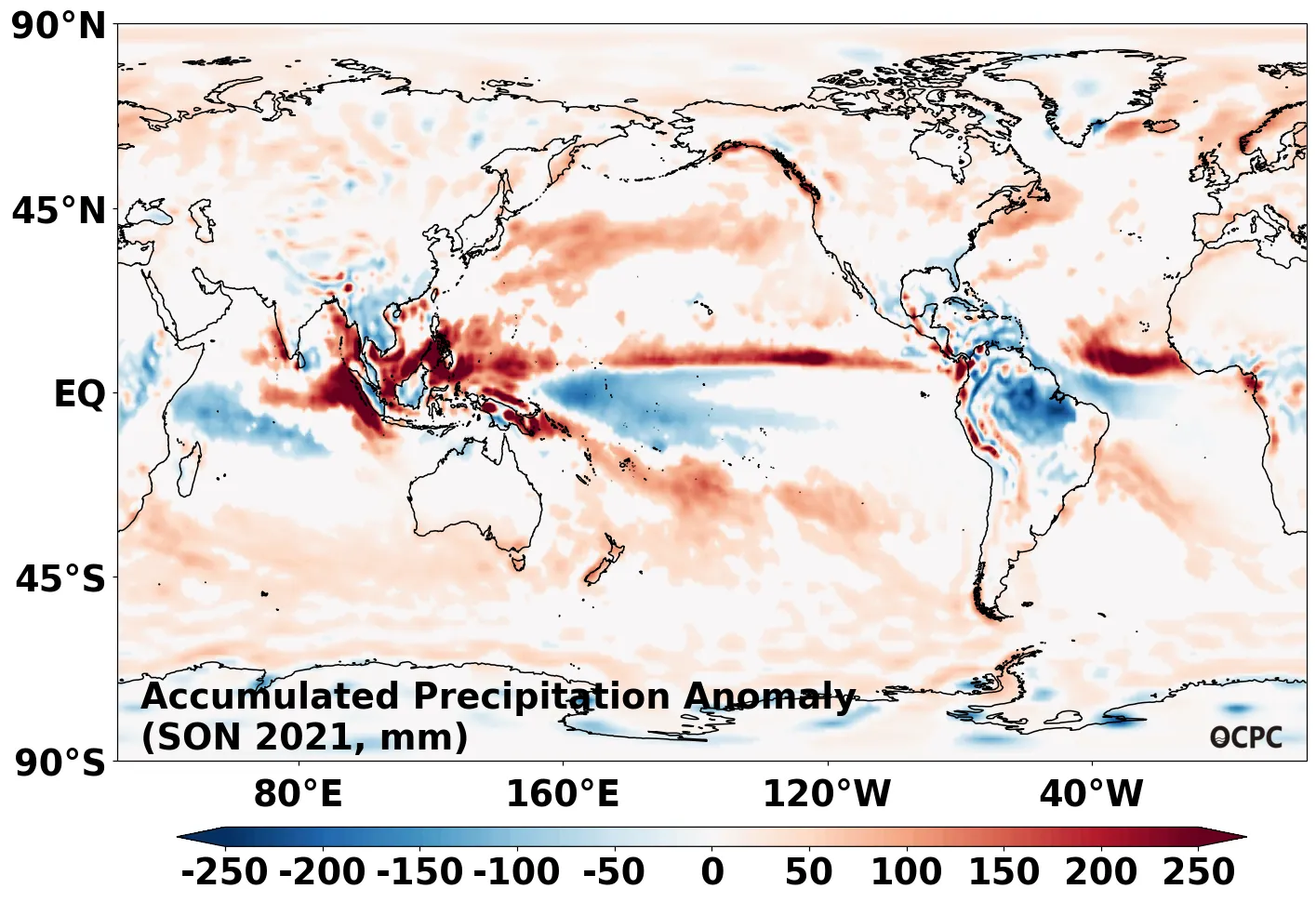A-B. 전지구 누적강수량 편차 전망(2021년 9~11월 평균, 채색표시: 평년 표준편차 초과 해역)