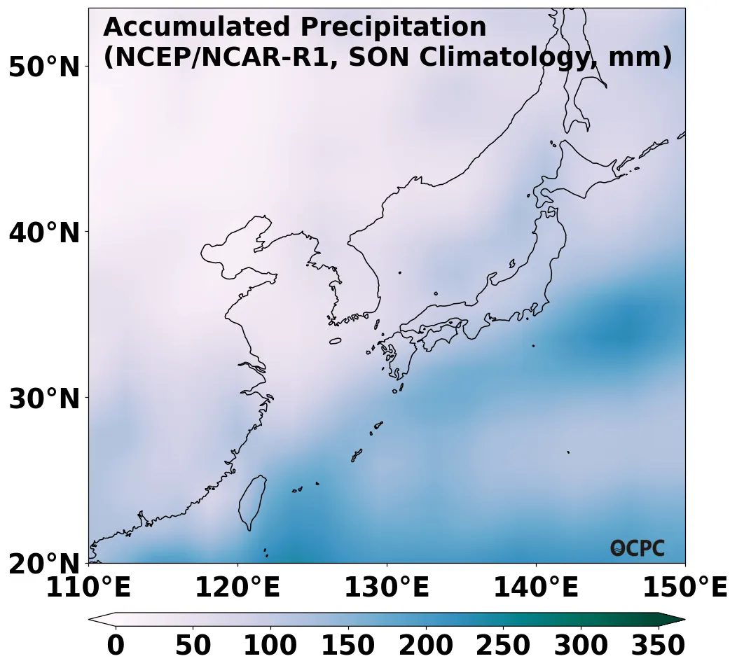 B. 한국주변해역 누적강수량(9~11월 평년평균)