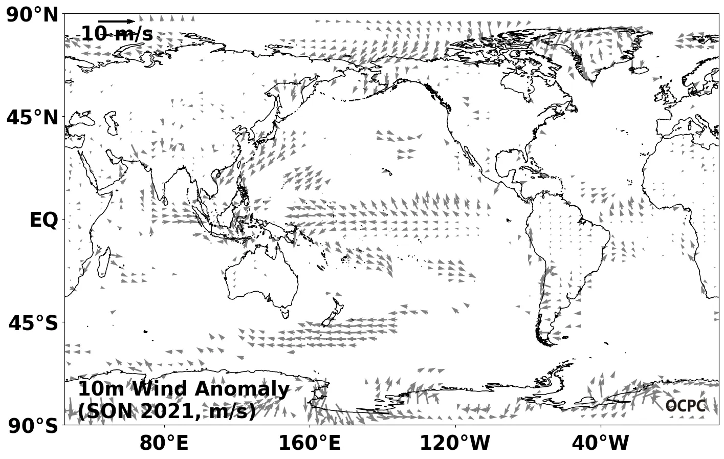 A-B. 전지구 해상풍 편차 전망(2021년 9~11월 평균, 벡터: 평년 표준편차 초과 해역)