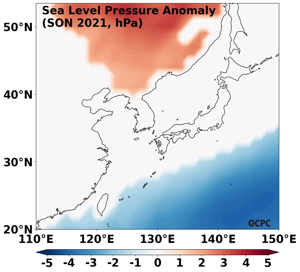 A-B. 한국주변해역 해면기압 편차 전망(2021년 9~11월 평균, 채색표시: 평년 표준편차 초과 해역)