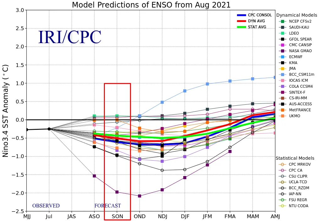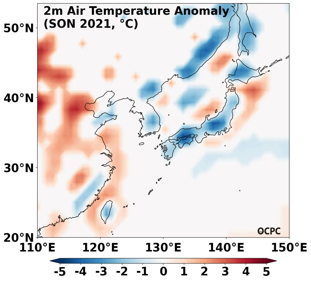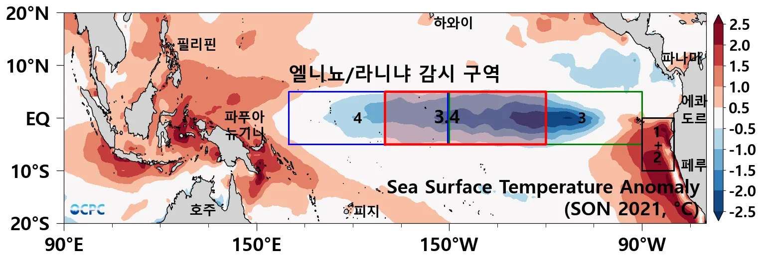 엘니뇨/라니냐 감시구역인 Nino3.4 해역(5°S~5°N, 170°W~120°W)의 9~11월(SON) 해면수온 편차는 평년 수준 또는 약한 라니냐 상태가 될 것으로 전망됩니다.