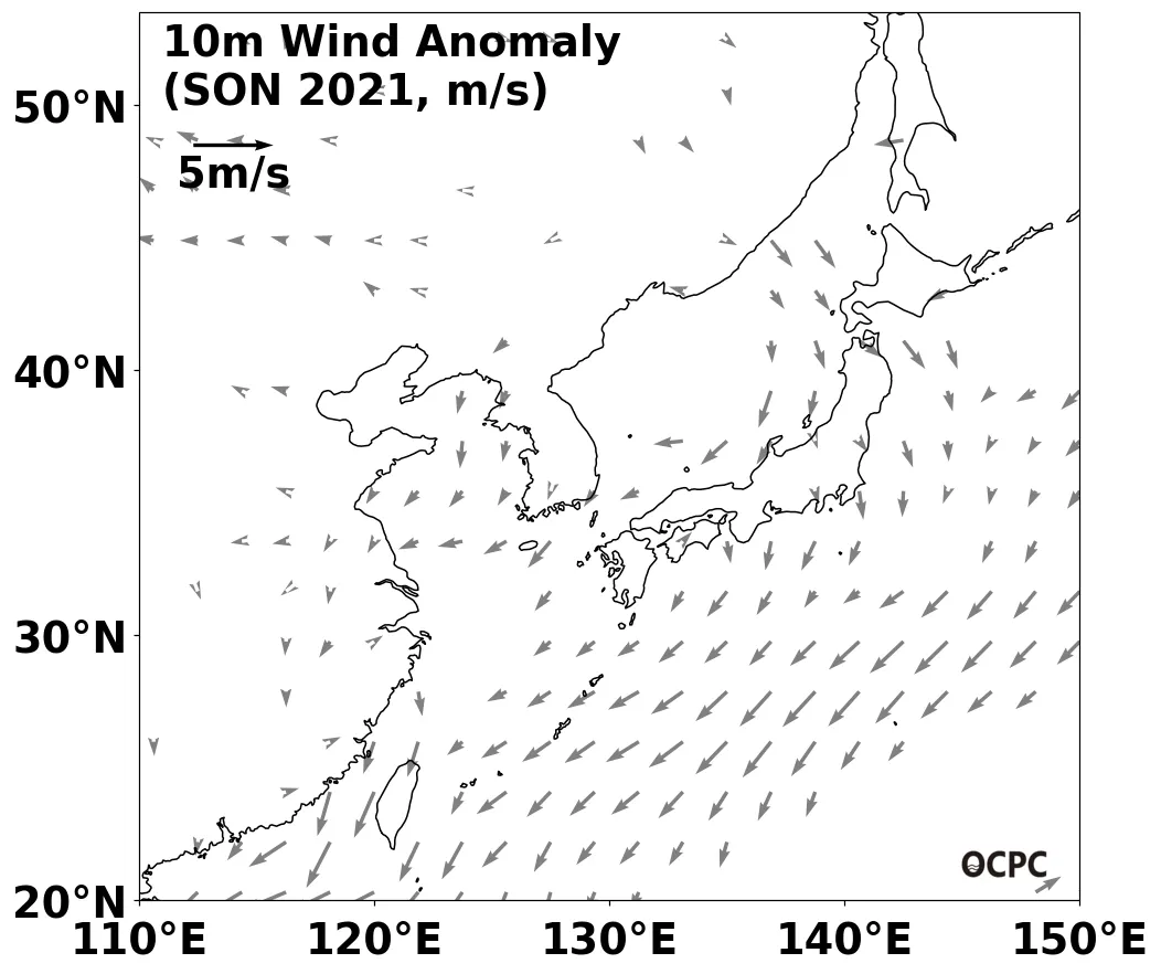 A-B. 한국주변해역 해상풍 편차 전망(2021년 9~11월 평균, 벡터: 평년 표준편차 초과 해역)
