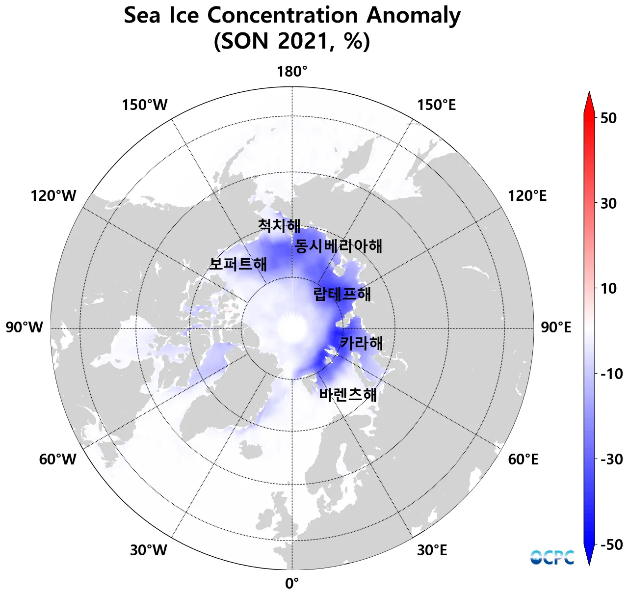 랍테프해, 바렌츠해, 카라해, 척치해, 동시베리아해 등에서의 해빙농도 감소가 두드러질 것으로 전망됩니다.