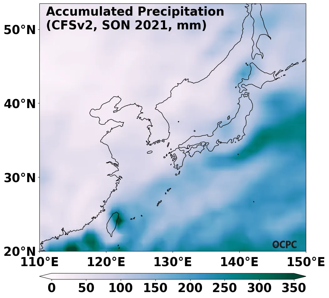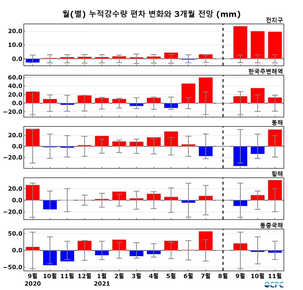 A. 한국주변해역 누적강수량 전망(2021년 9~11월 평균)