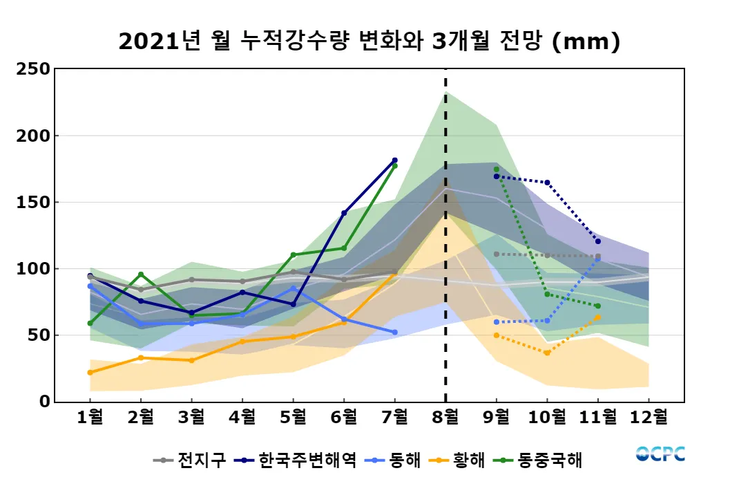 전지구 해상강수량은 평년보다 많겠으며, 동해, 황해, 동중국해는 평년과 비슷하겠습니다.