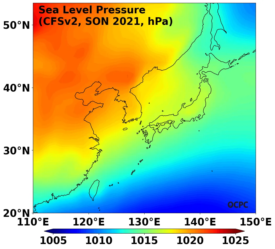 A. 한국주변해역 해면기압 전망(2021년 9~11월 평균)