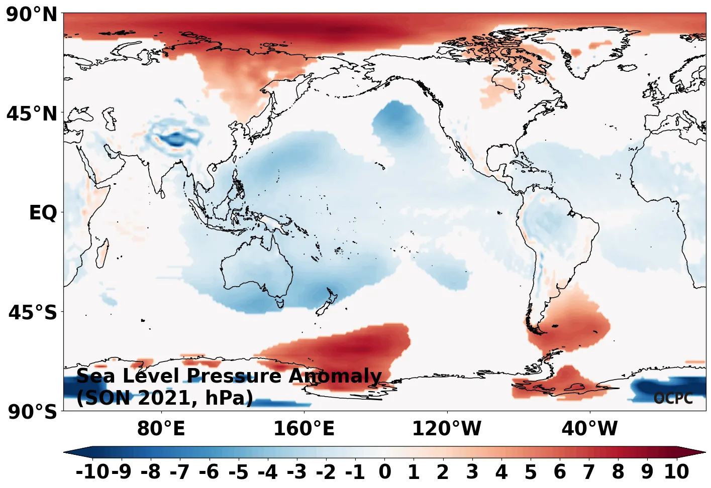 A-B. 전지구 해면기압 편차 전망(2021년 9~11월 평균, 채색표시: 평년 표준편차 초과 해역)