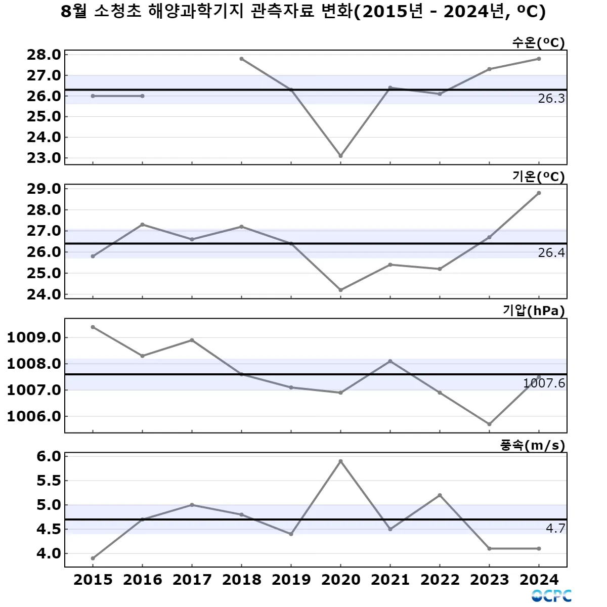 소청초 기지의 수온(27.8℃)은 관측기간 평균(26.3±0.7℃)보다 1.5℃ 높았습니다.