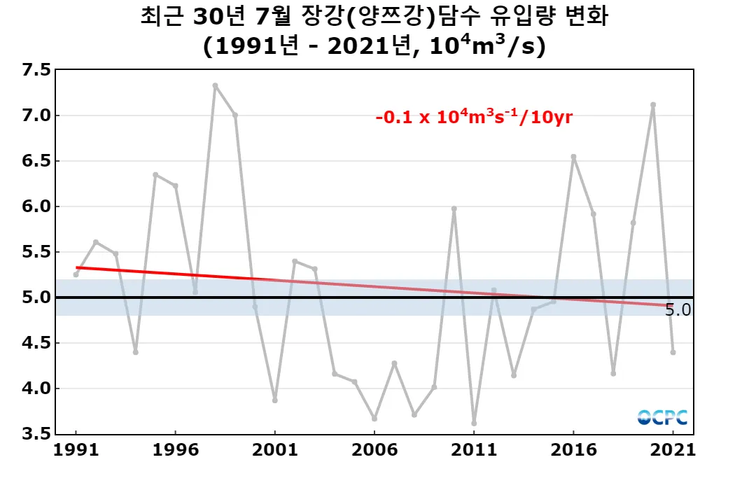 최근 30년 7월 양쯔강 담수 유입량은 10년에 약 1천톤씩 감소하는 추세입니다.