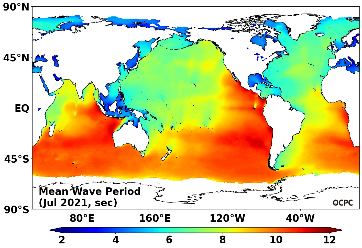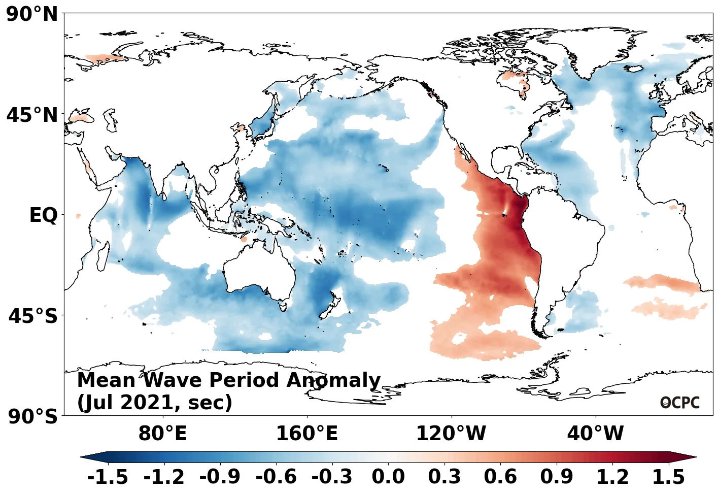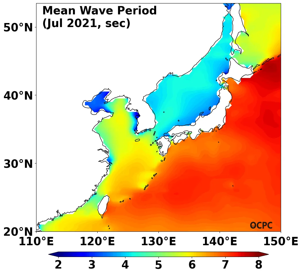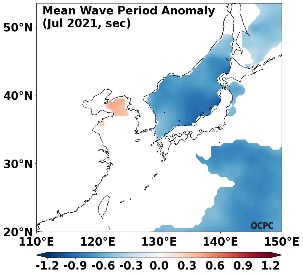 최근 30년 동안 7월의 전지구 평균파주기는 10년에 0.1초씩 감소하며, 한국주변해역은 0.02초씩 감소하는 추세입니다.