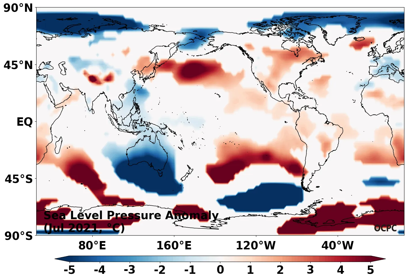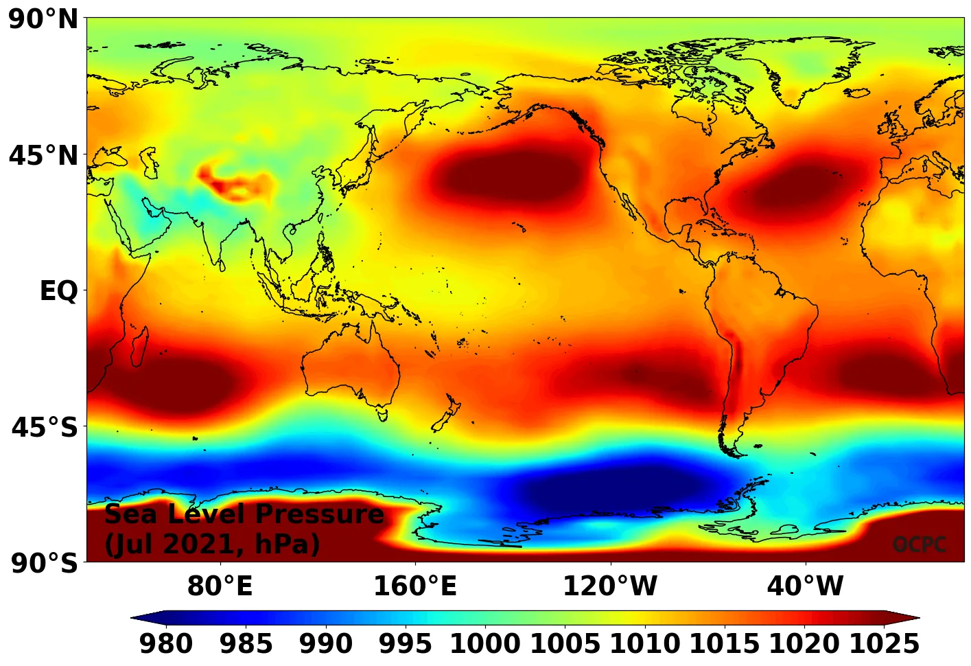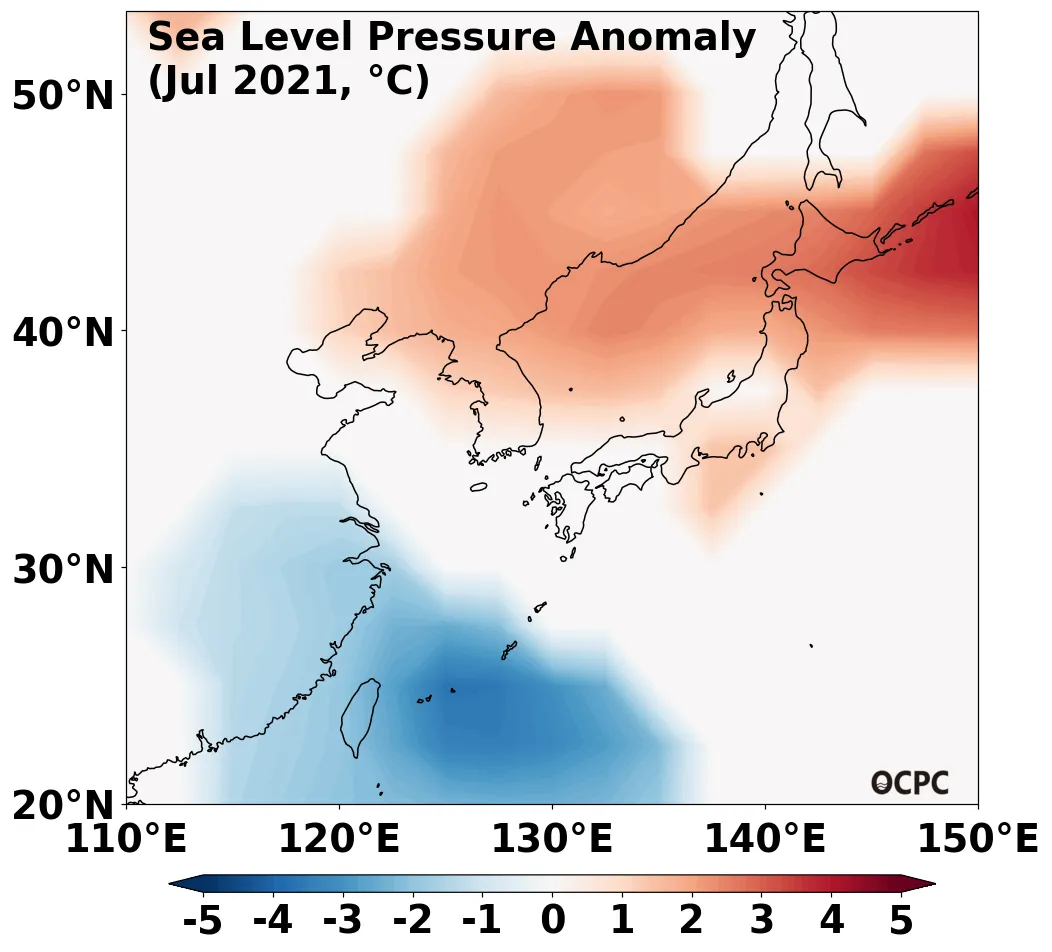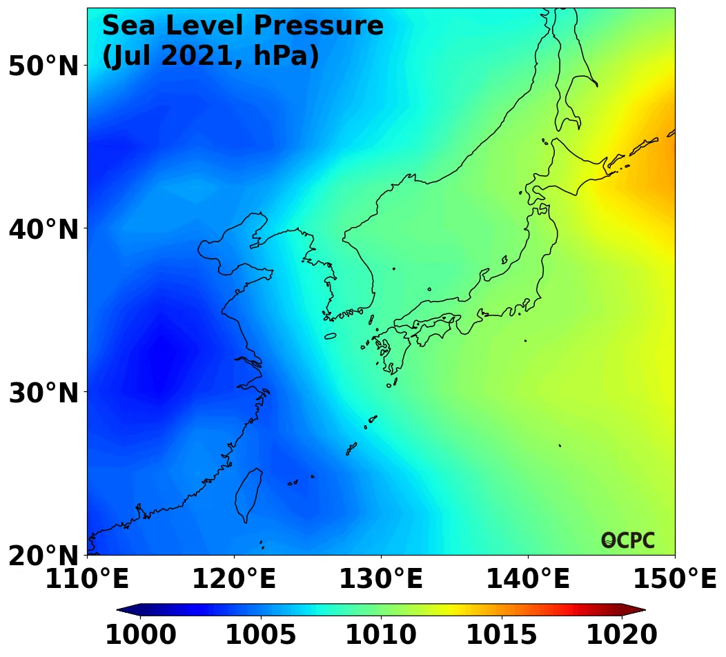 최근 30년 동안 전지구 및 한국주변해역의 7월 해면기압은 10년에 0.1hPa씩 증가하는 추세입니다.